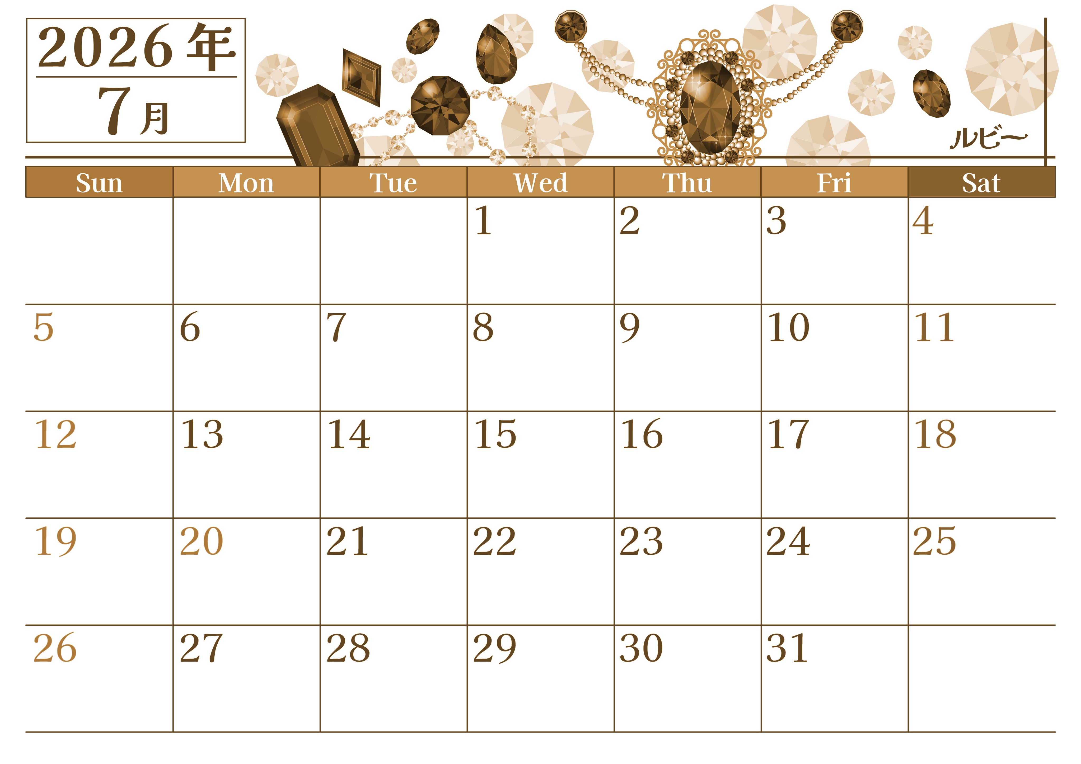 2026年7月横型レトロな日曜始まりの無料テンプレートセピア調カレンダーです。7月の誕生石であるルビーのアクセサリーを贅沢に存在感あるように描いているおしゃれで女心をくすぐるようなイラストセピア調カレンダーです。(2026-00770700)