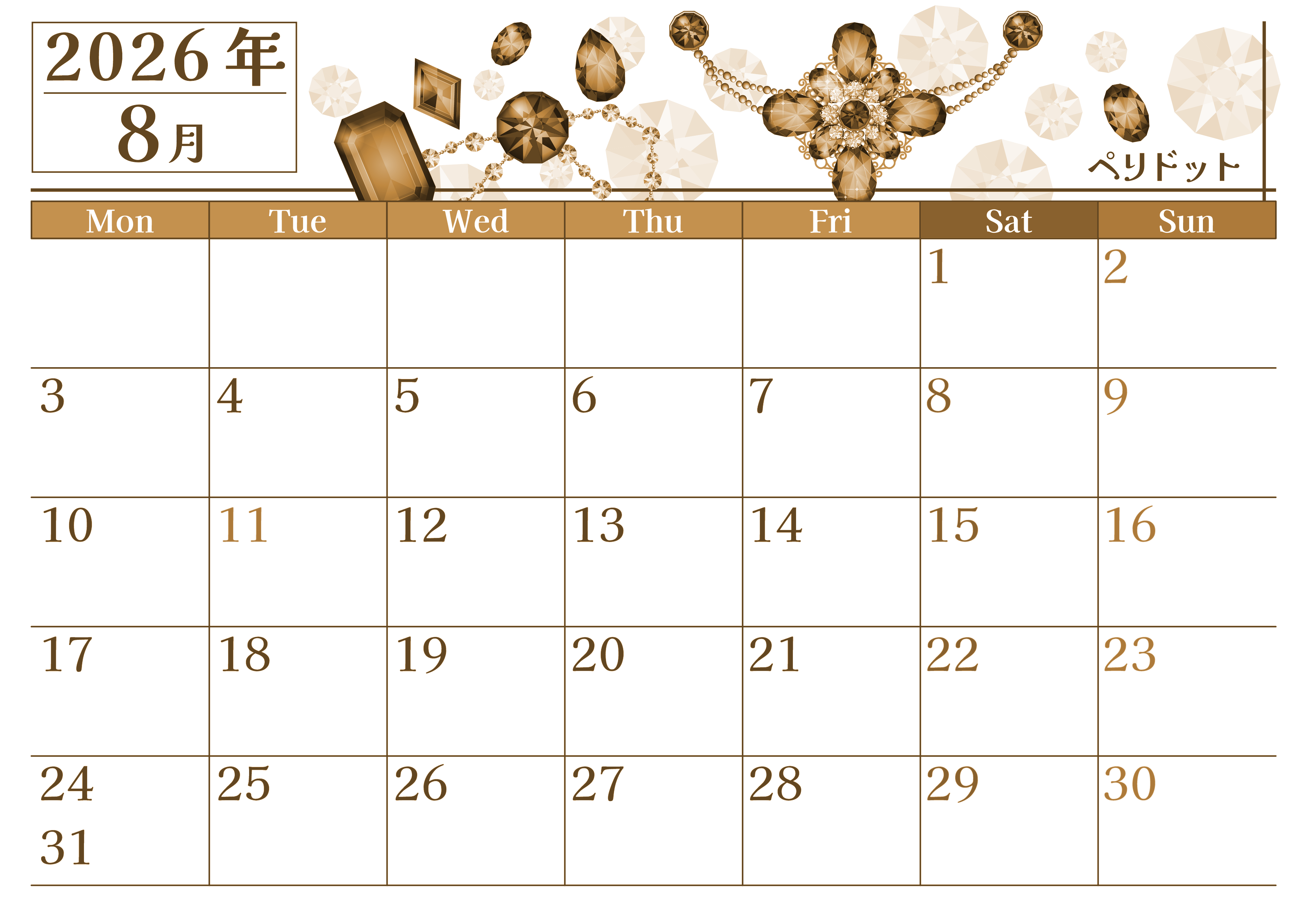 2026年8月横型レトロな月曜始まりの無料テンプレートセピア調カレンダーです。8月の誕生石であるペリドットを取り上げている豪華でラグジュアリーな使っていて贅沢な気持ちになるフリー素材です。(2026-00770801)