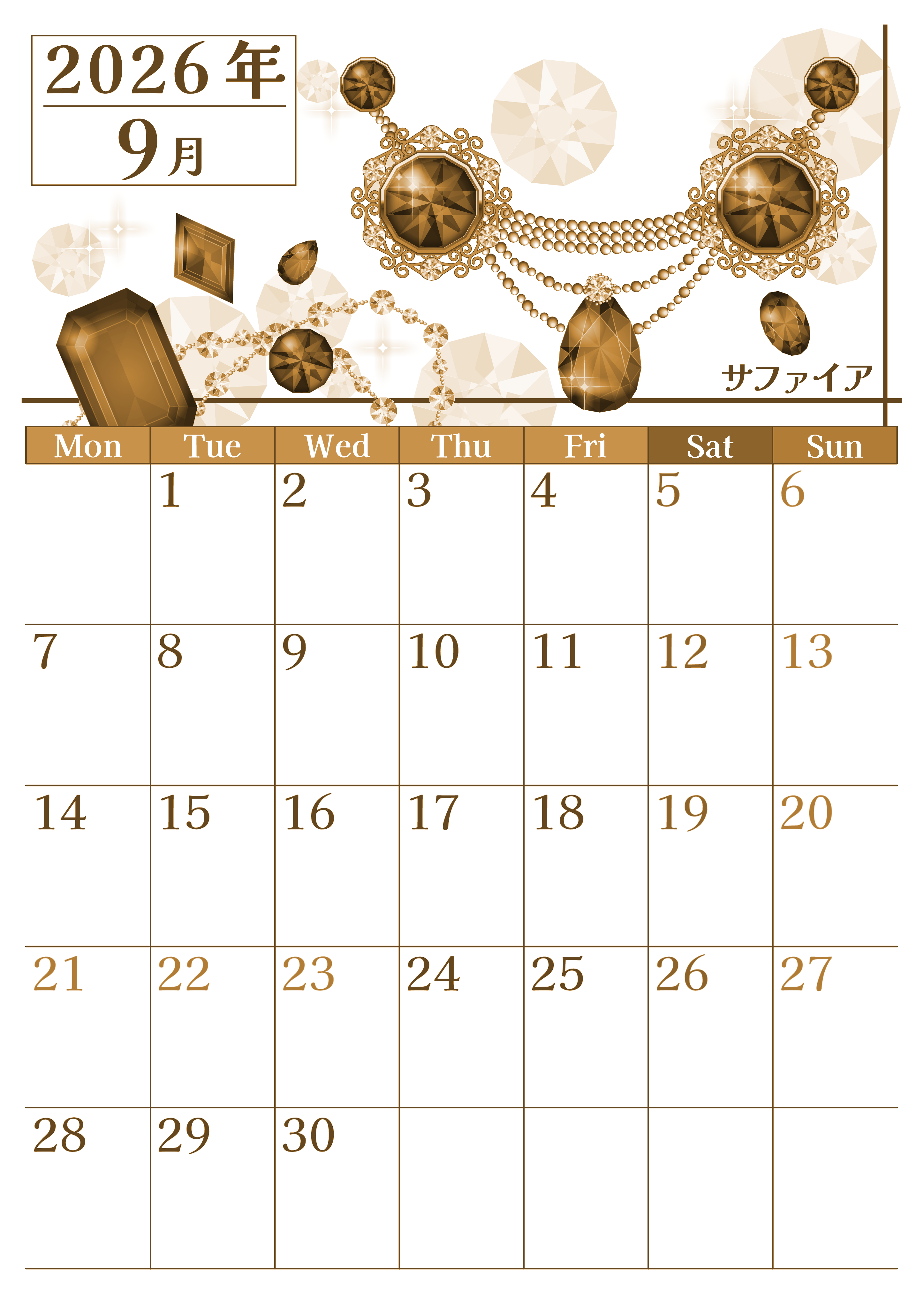 2026年9月縦型レトロな月曜始まりの無料テンプレートセピア調カレンダーです。サファイアは群青色の宝石で9月の誕生石にあたります。おしゃれで輝いている女性に特におすすめをしたいイラストセピア調カレンダーとなっています。(2026-00770911)