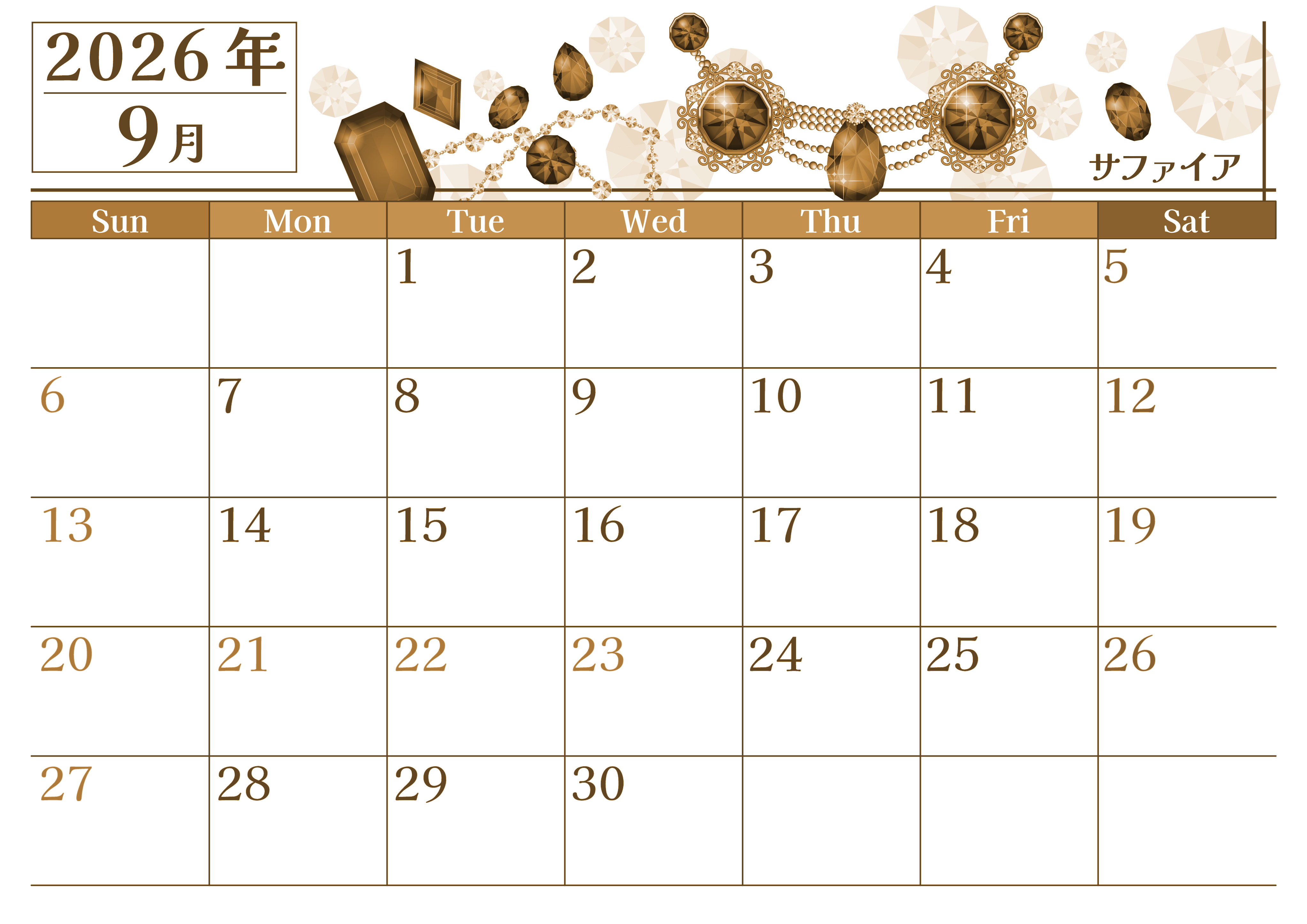 2026年9月横型レトロな日曜始まりの無料テンプレートセピア調カレンダーです。9月の誕生石であるサファイアのアクセサリーを贅沢に存在感あるように描いているおしゃれで女心をくすぐるようなイラストセピア調カレンダーです。(2026-00770900)