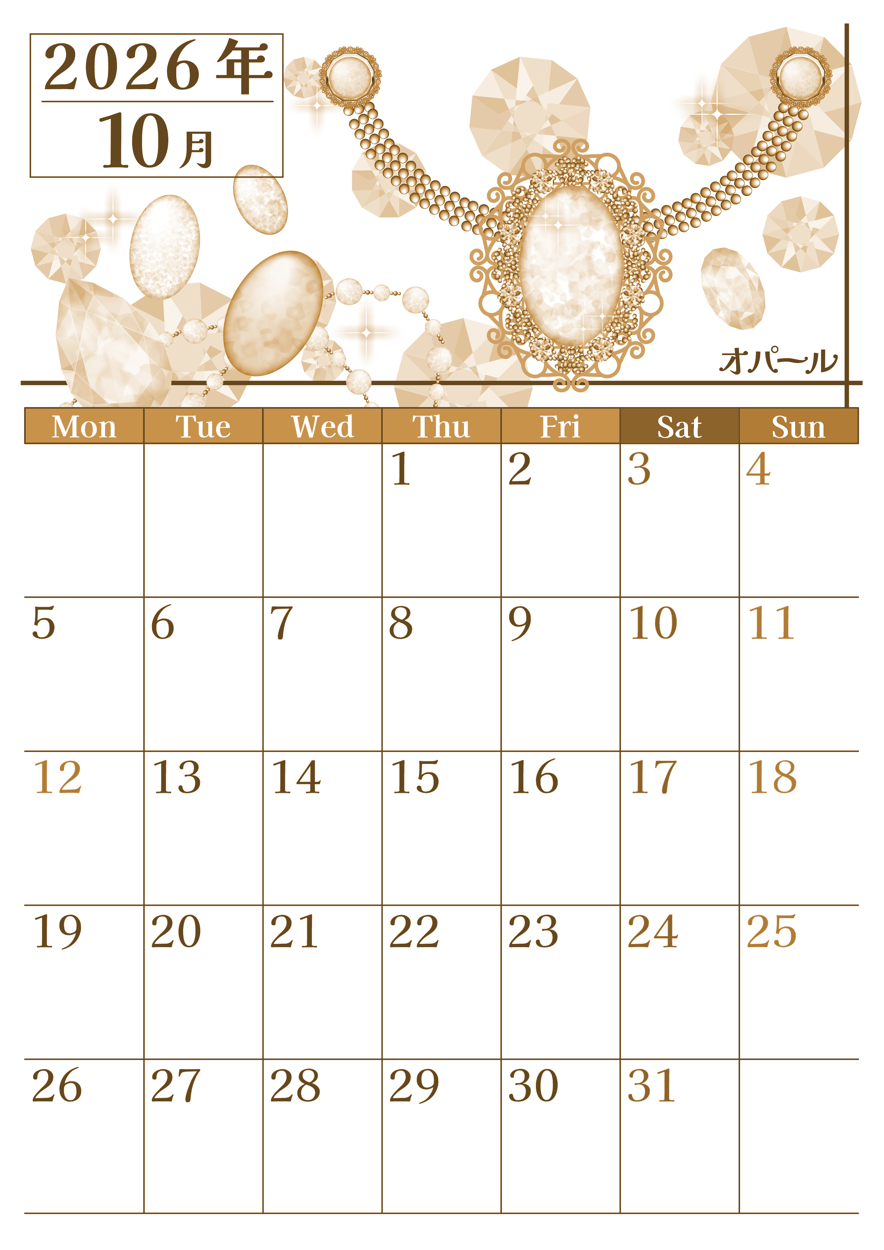 2026年10月縦型レトロな月曜始まりの無料テンプレートセピア調カレンダーです。オパールは不思議な色合いの宝石で10月の誕生石にあたります。おしゃれで輝いている女性に特におすすめをしたいイラストセピア調カレンダーとなっています。(2026-00771011)