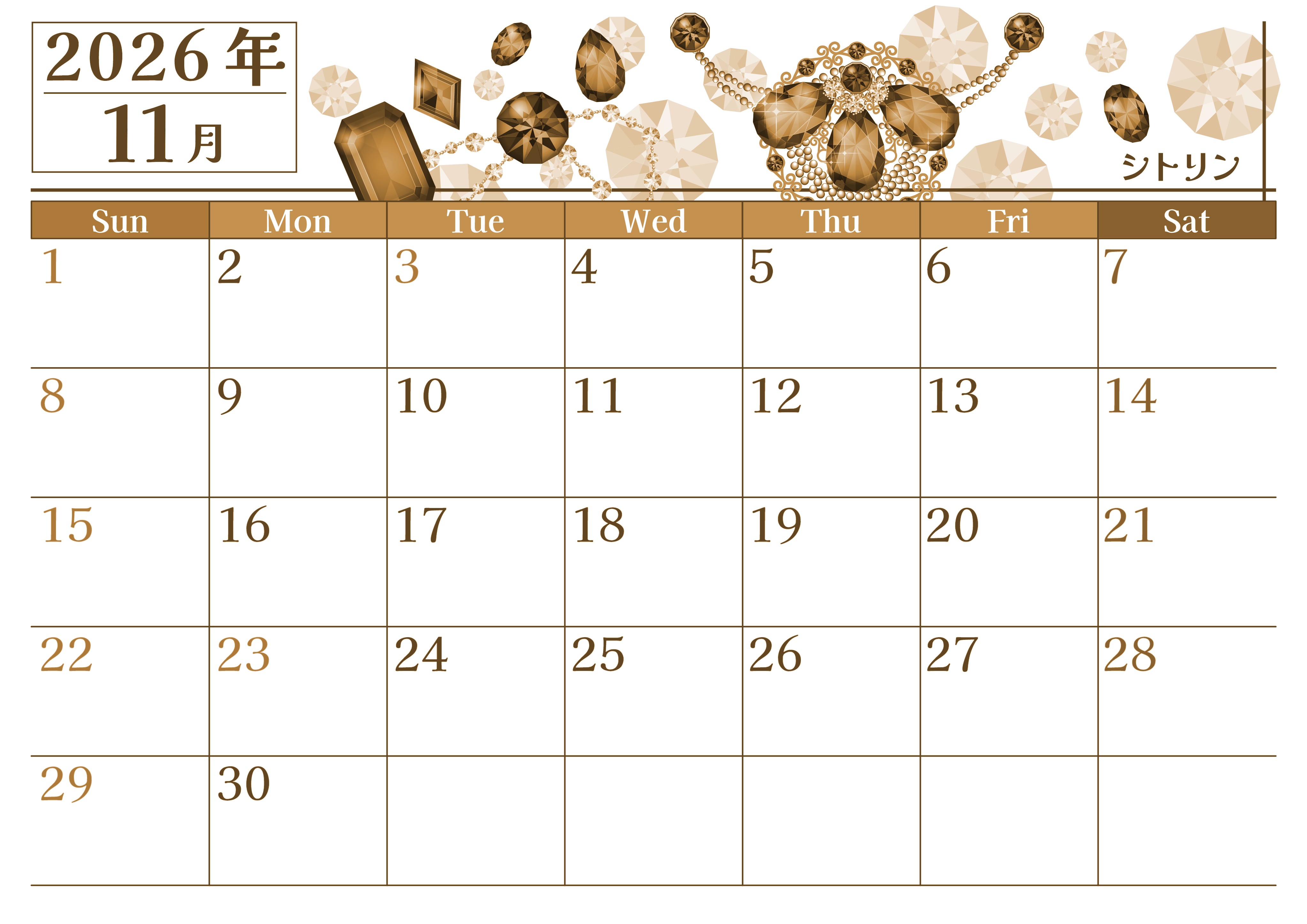 2026年11月横型レトロな日曜始まりの無料テンプレートセピア調カレンダーです。11月の誕生石であるシトリンのアクセサリーを贅沢に存在感あるように描いているおしゃれで女心をくすぐるようなイラストセピア調カレンダーです。(2026-00771100)