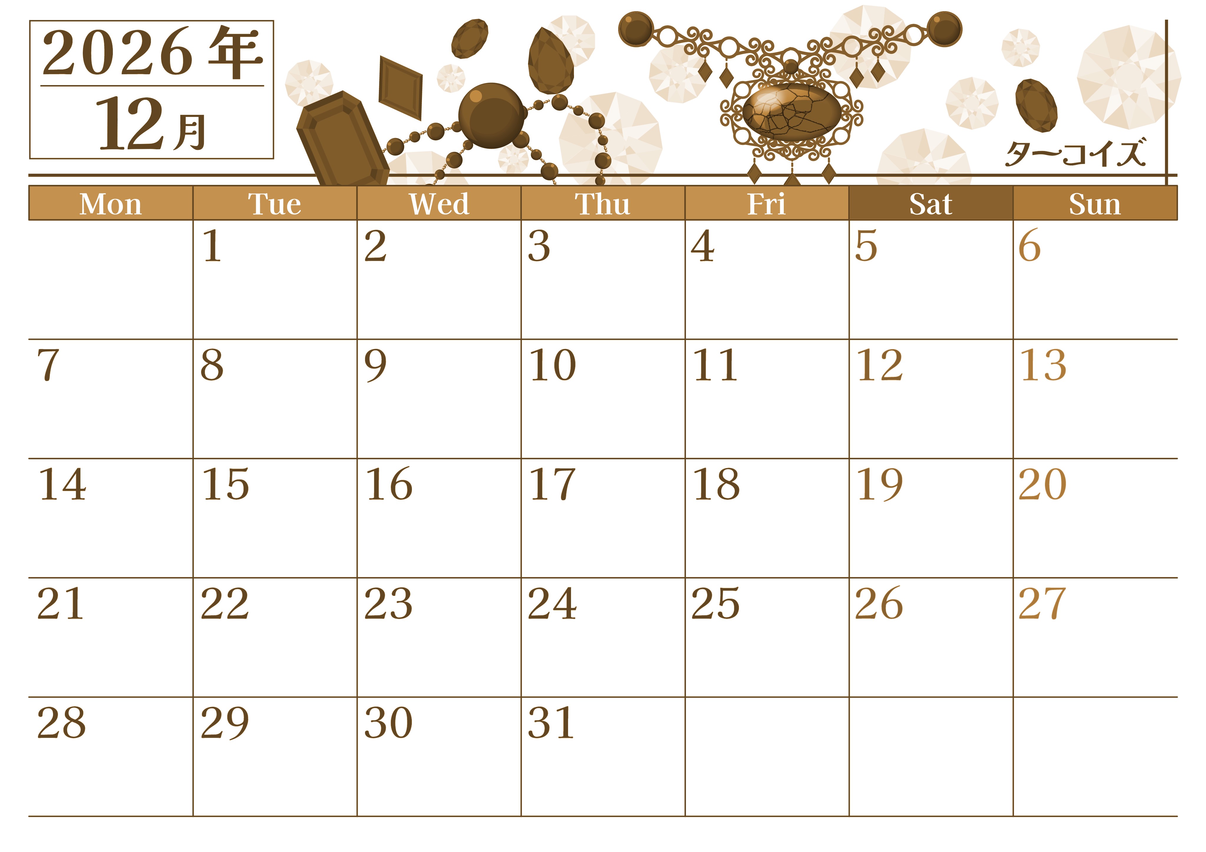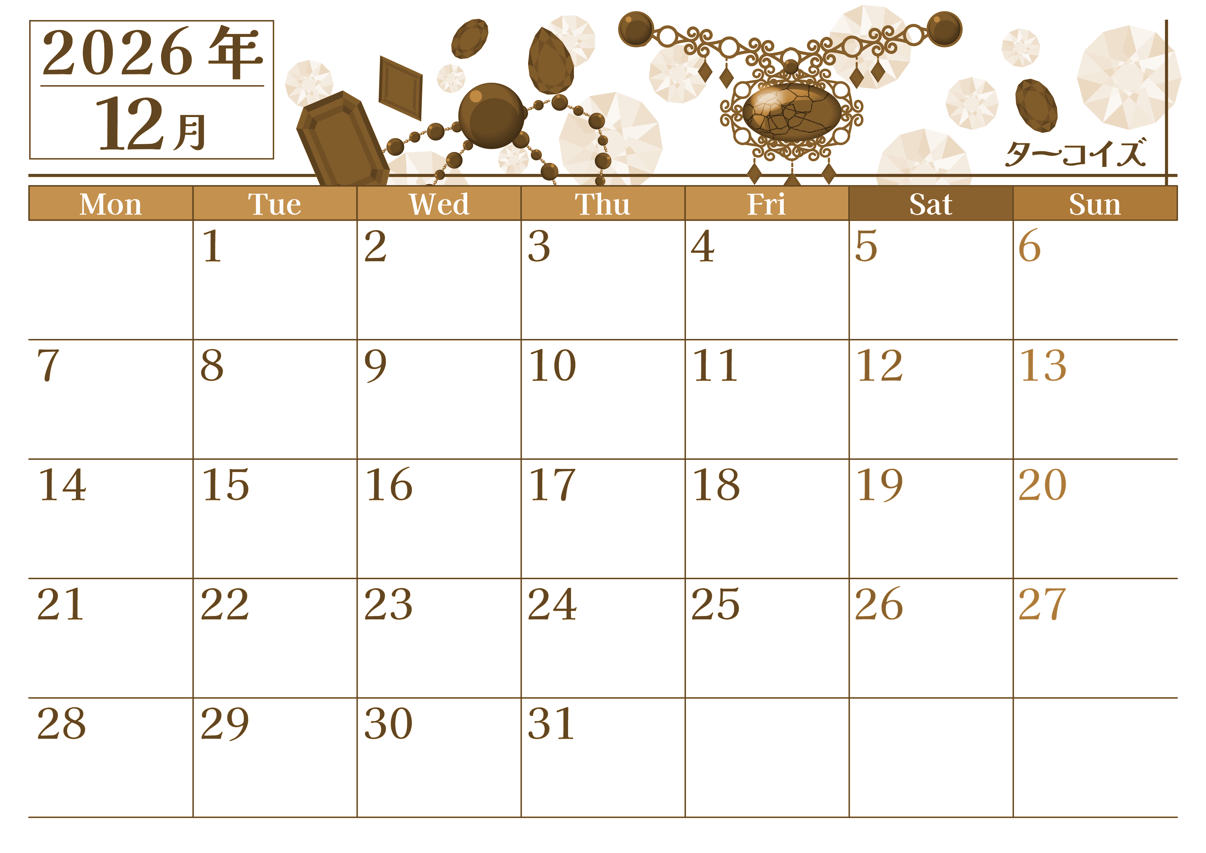 2026年・無料のカレンダーテンプレート 2026年12月横型レトロな月曜始まり 誕生石イラストのおしゃれA4無料セピア調カレンダー(2026-00771201) 素材状デザイン王 2025年4月2日 2026年12月横型レトロな月曜始まりの無料テンプレートセピア調カレンダーです。12月の誕生石であるターコイズを取り上げている豪華でラグジュアリーな使っていて贅沢な気持ちになるフリー素材です。(2026-00771201) 12月 横型のカレンダー 月曜始まり セピア カレンダーデザイン-0077