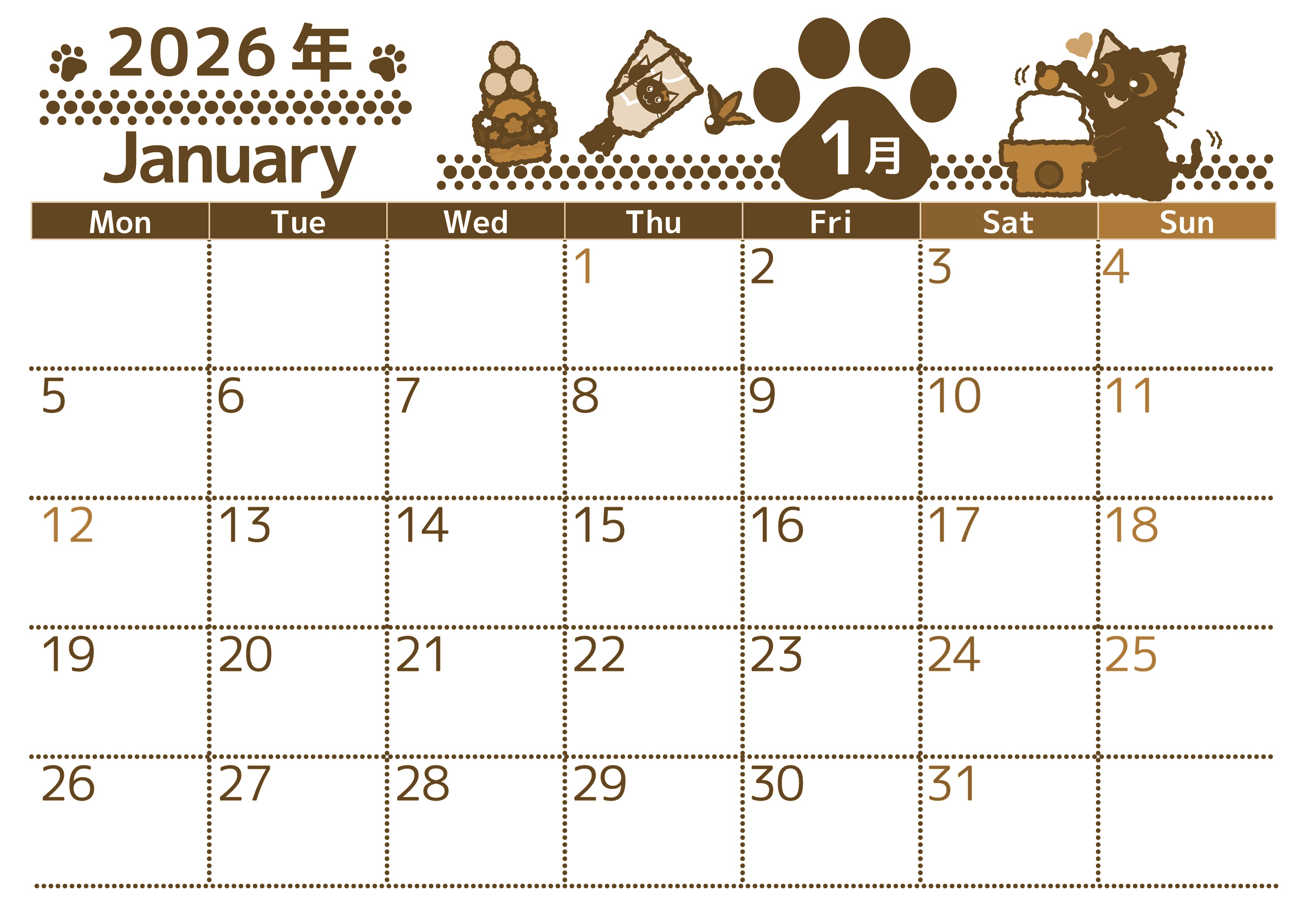 2026年・無料のカレンダーテンプレート 2026年1月横型レトロな月曜始まり イラストのかわいいA4無料セピア調カレンダー(2026-00780101) 素材状デザイン王 2025年4月2日 2026年1月横型レトロな月曜始まりの無料テンプレートセピア調カレンダーです。かわいい子猫のイラストが魅力的でありながらスケジュールを書き込みやすいスタンダードでシンプルなデザインです。(2026-00780101) 1月 横型のカレンダー 月曜始まり セピア カレンダーデザイン-0078
