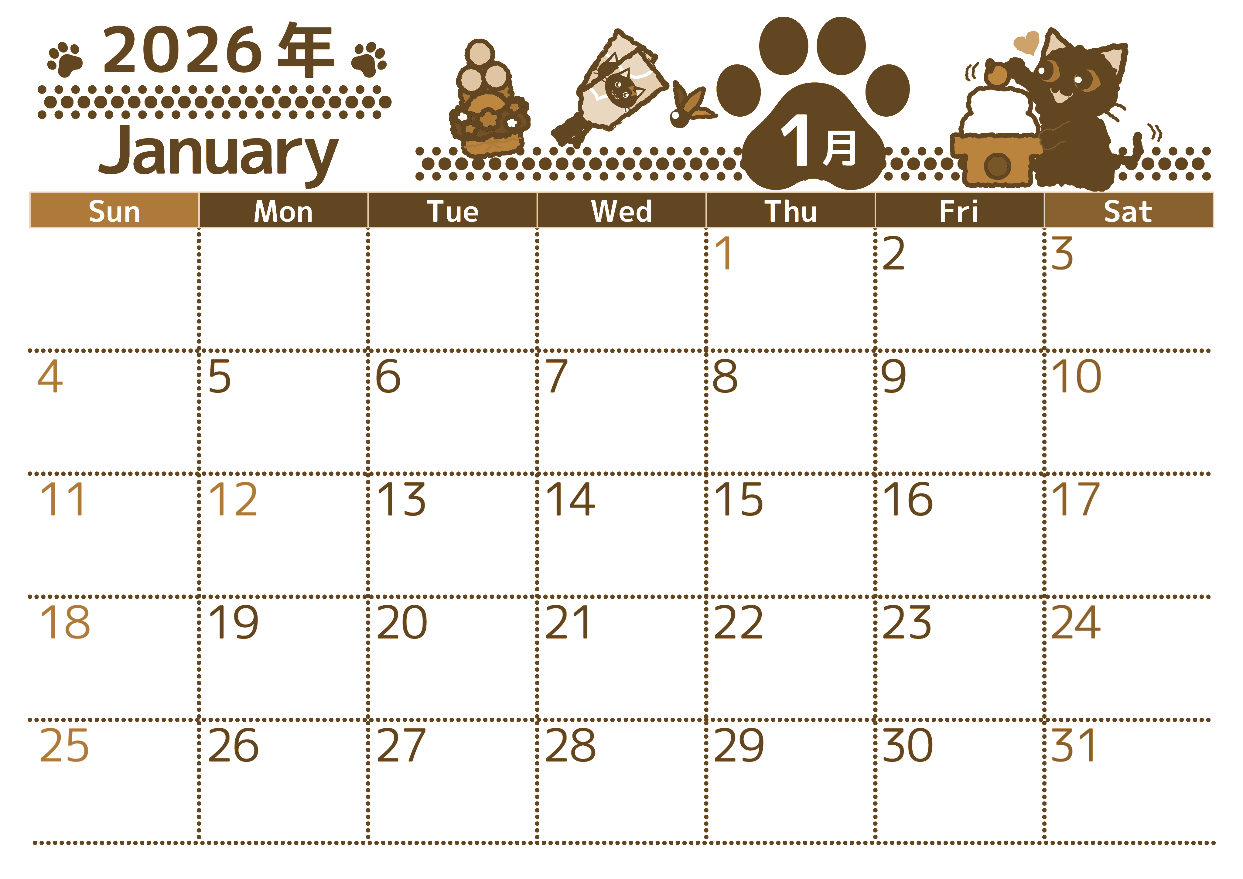 2026年1月横型レトロな日曜始まりの無料テンプレートセピア調カレンダーです。猫がかがみもちのみかんに興味をもっていじくりまわしているかわいいが溢れて止まらない猫好きにはたまらないイラストつきのフリー素材となっています。(2026-00780100)