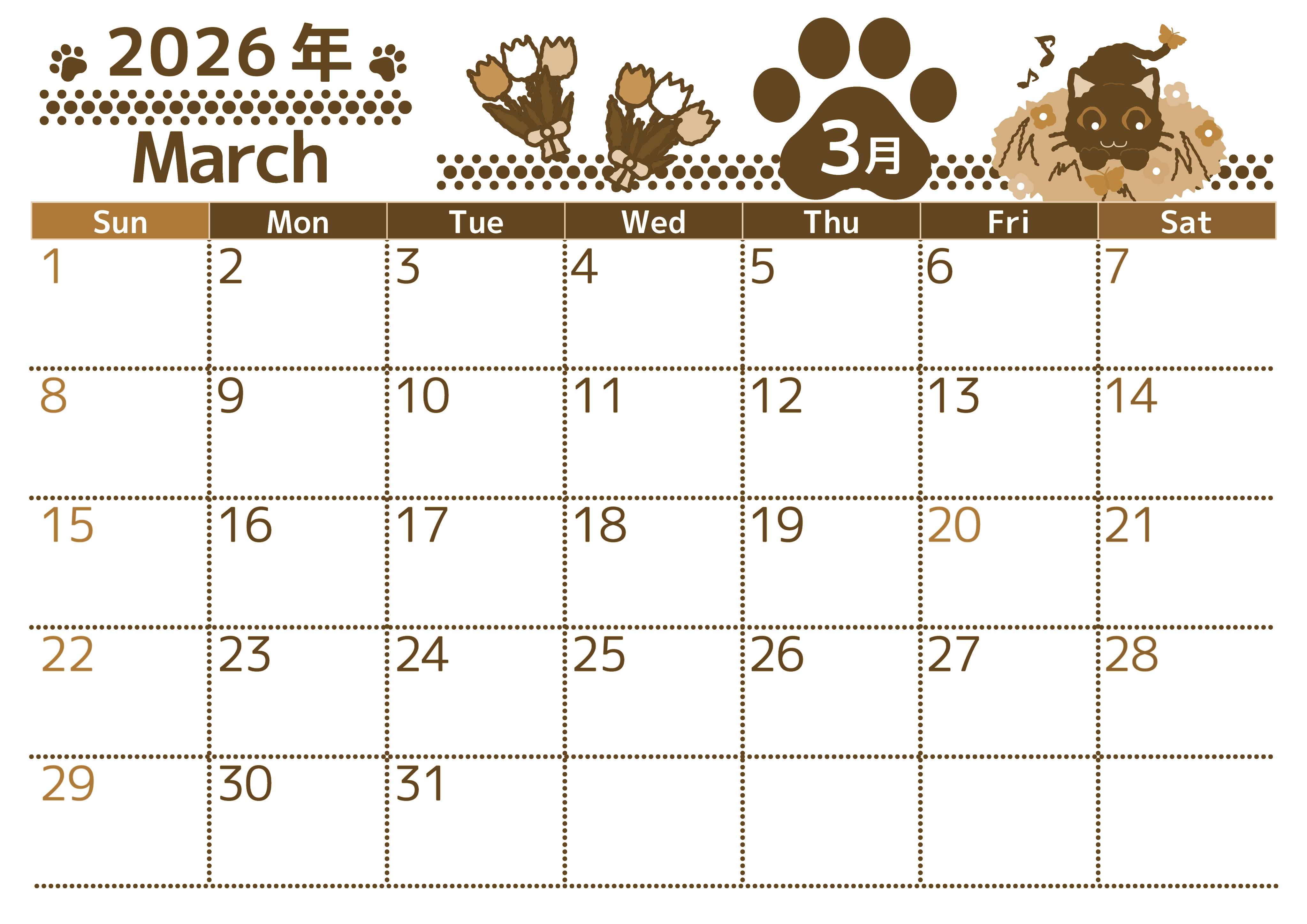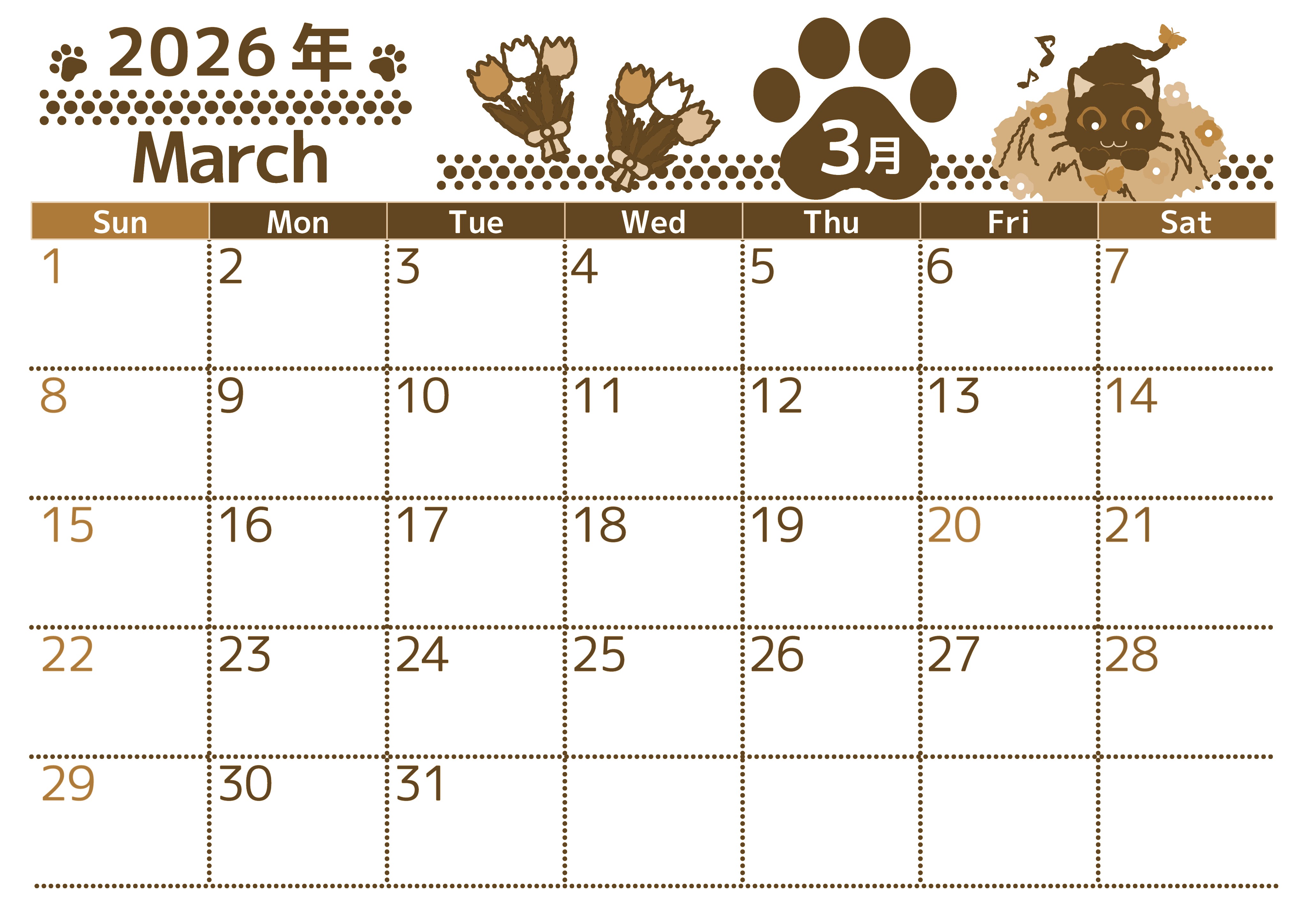 2026年3月横型レトロな日曜始まりの無料テンプレートセピア調カレンダーです。猫の肉球がとてもかわいい猫好きにはたまらないかわいいイラスト付きです。罫線で囲まれている日にち部分は広い余白があるので予定を書き込みやすいです。(2026-00780300)