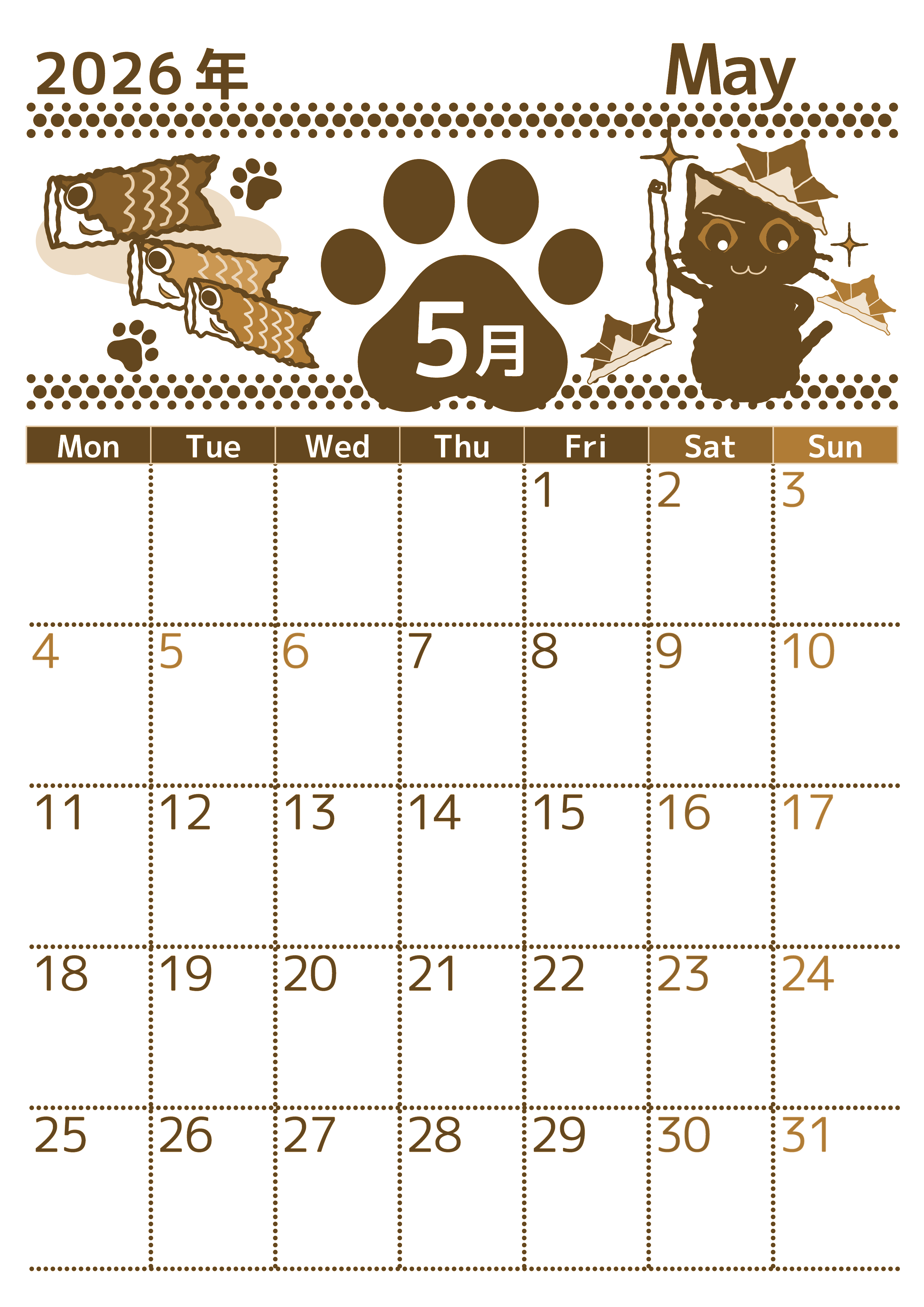 2026年5月縦型レトロな月曜始まりの無料テンプレートセピア調カレンダーです。3匹の鯉のぼり、3つの折り紙で作られた兜、生き生きとした猫のコントラストが特徴的な全体的にかわいい雰囲気のポップなイラストセピア調カレンダーです。(2026-00780511)