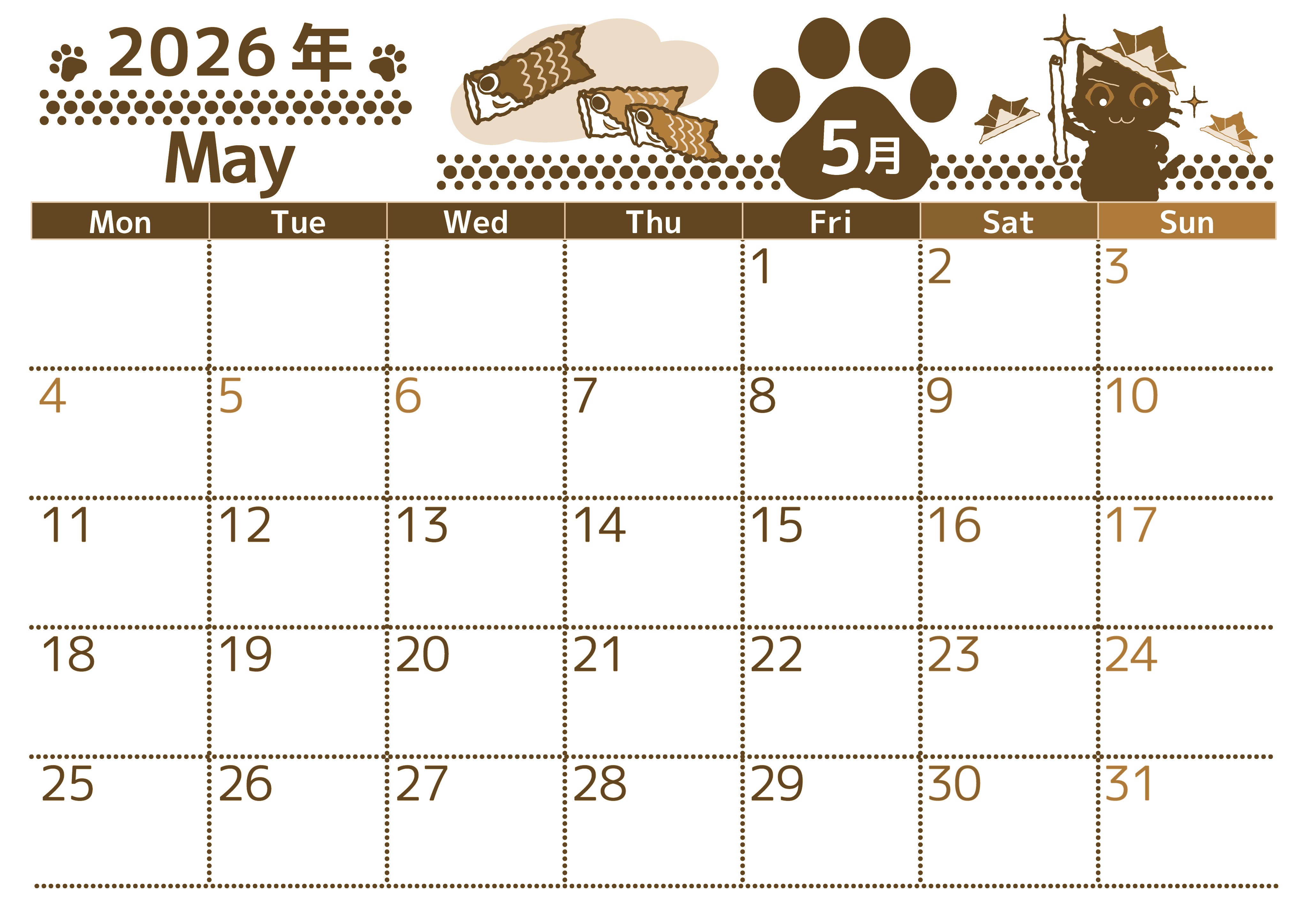 2026年5月横型レトロな月曜始まりの無料テンプレートセピア調カレンダーです。元気いっぱいな男の子の猫がこどもの日を堪能している様子をテーマに描かれたイラスト付きの見やすいセピア調カレンダーはダウンロードが無料です。(2026-00780501)