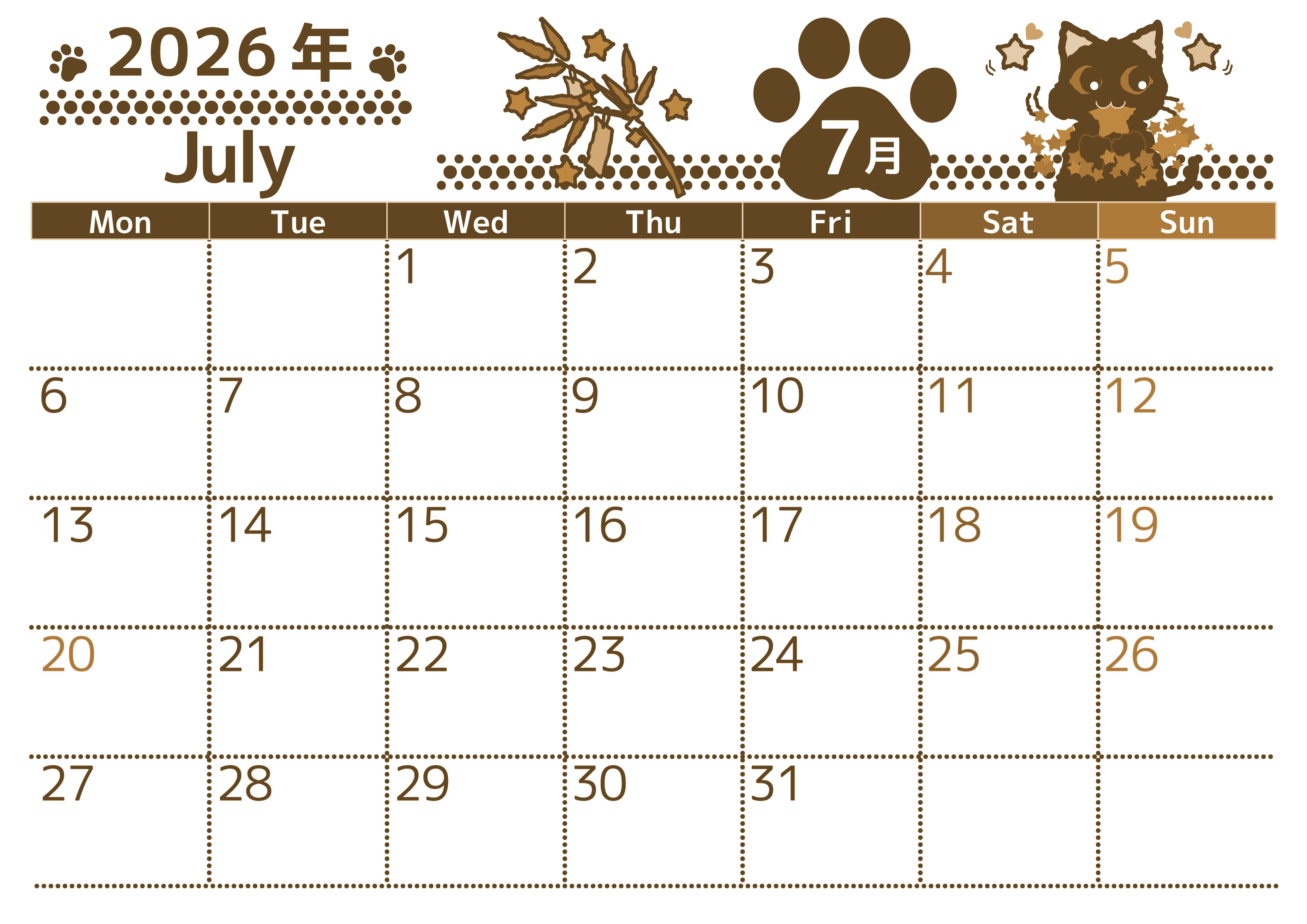 2026年7月横型レトロな月曜始まりの無料テンプレートセピア調カレンダーです。七夕をテーマにした猫が主役のかわいい動物好きにはたまらないデザインのイラスト付きです。曜日によって文字の色分けがされているのも見やすいポイントです。(2026-00780701)