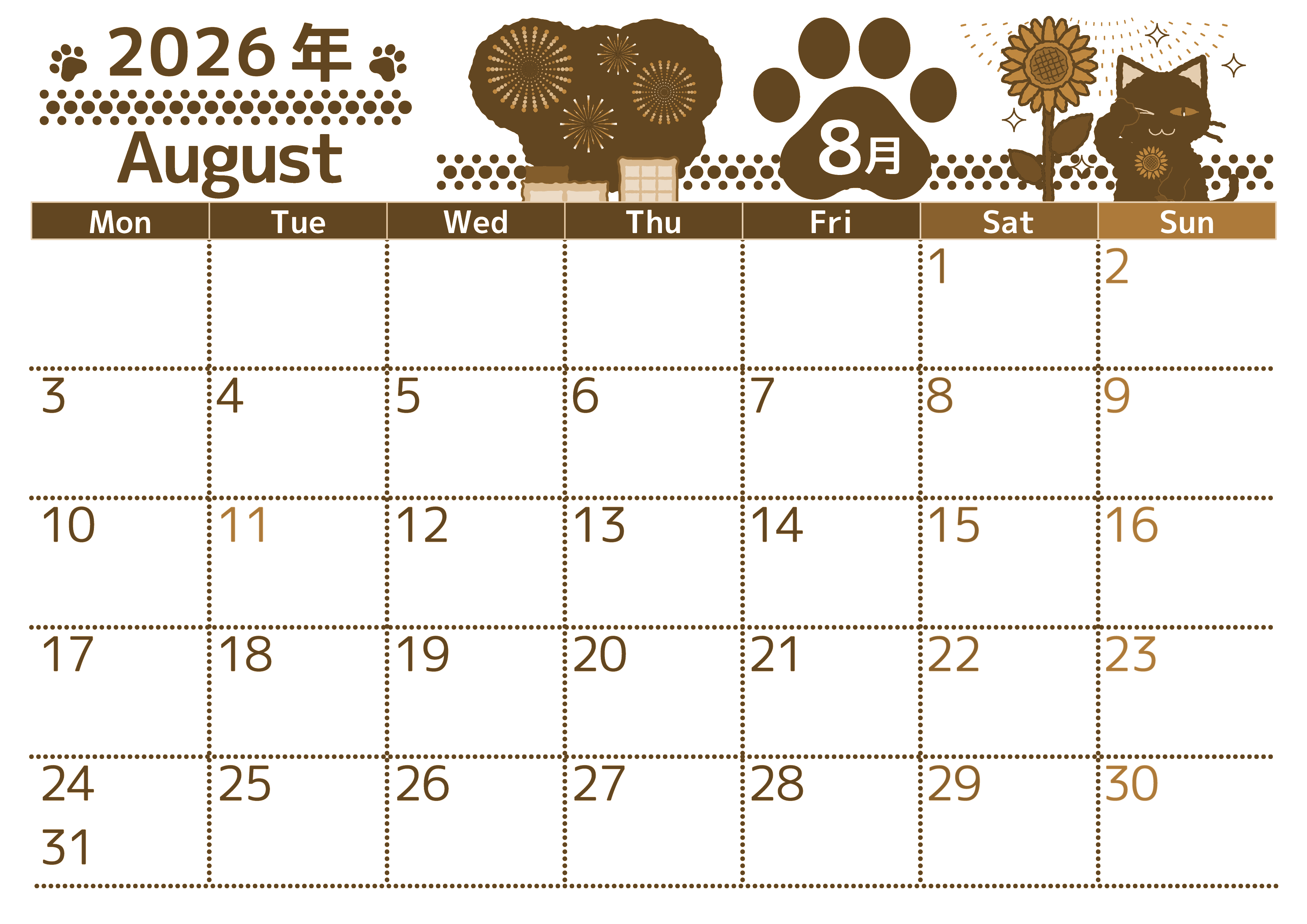 2026年8月横型レトロな月曜始まりの無料テンプレートセピア調カレンダーです。夏休みを連想させるアイテムが盛りだくさんの猫を主役にしたかわいいイラストが目を引きます。セピア調カレンダー部分も余白が広いので予定を書き込みやすいです。(2026-00780801)