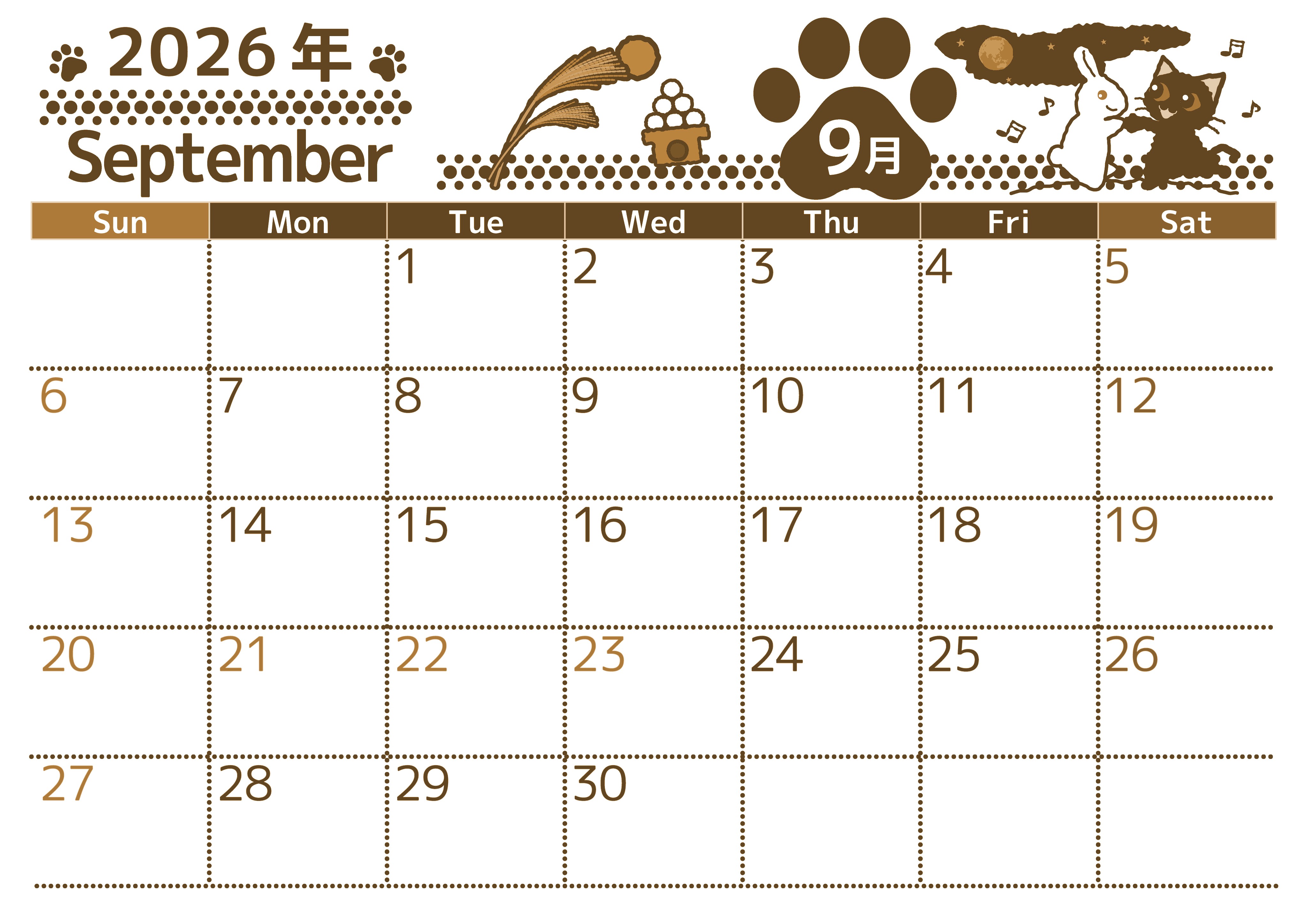 2026年9月横型レトロな日曜始まりの無料テンプレートセピア調カレンダーです。猫と白うさぎが手を取り合ってダンスをしているとても平和でかわいい十五夜をテーマにした秋感満載のイラストです。(2026-00780900)