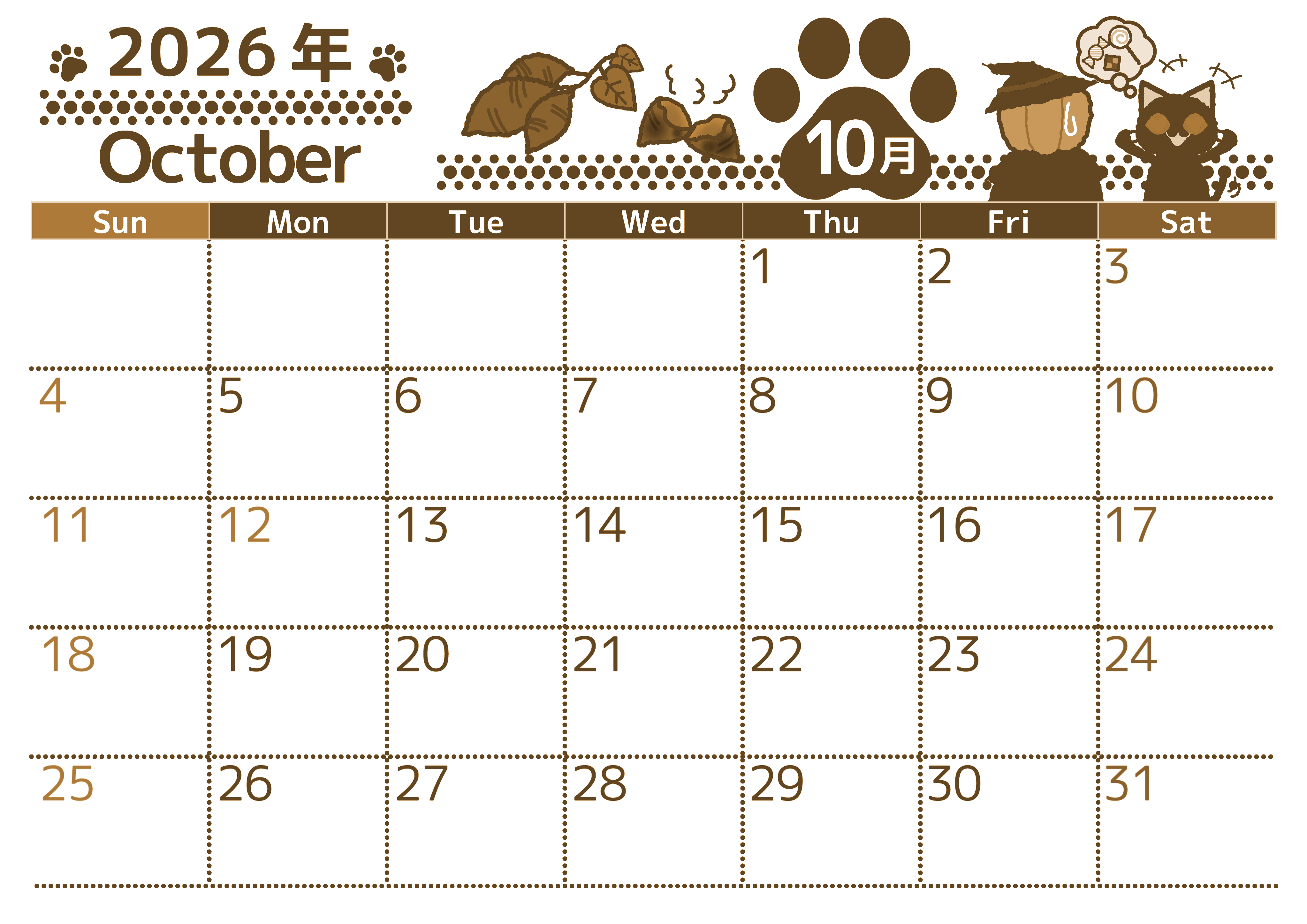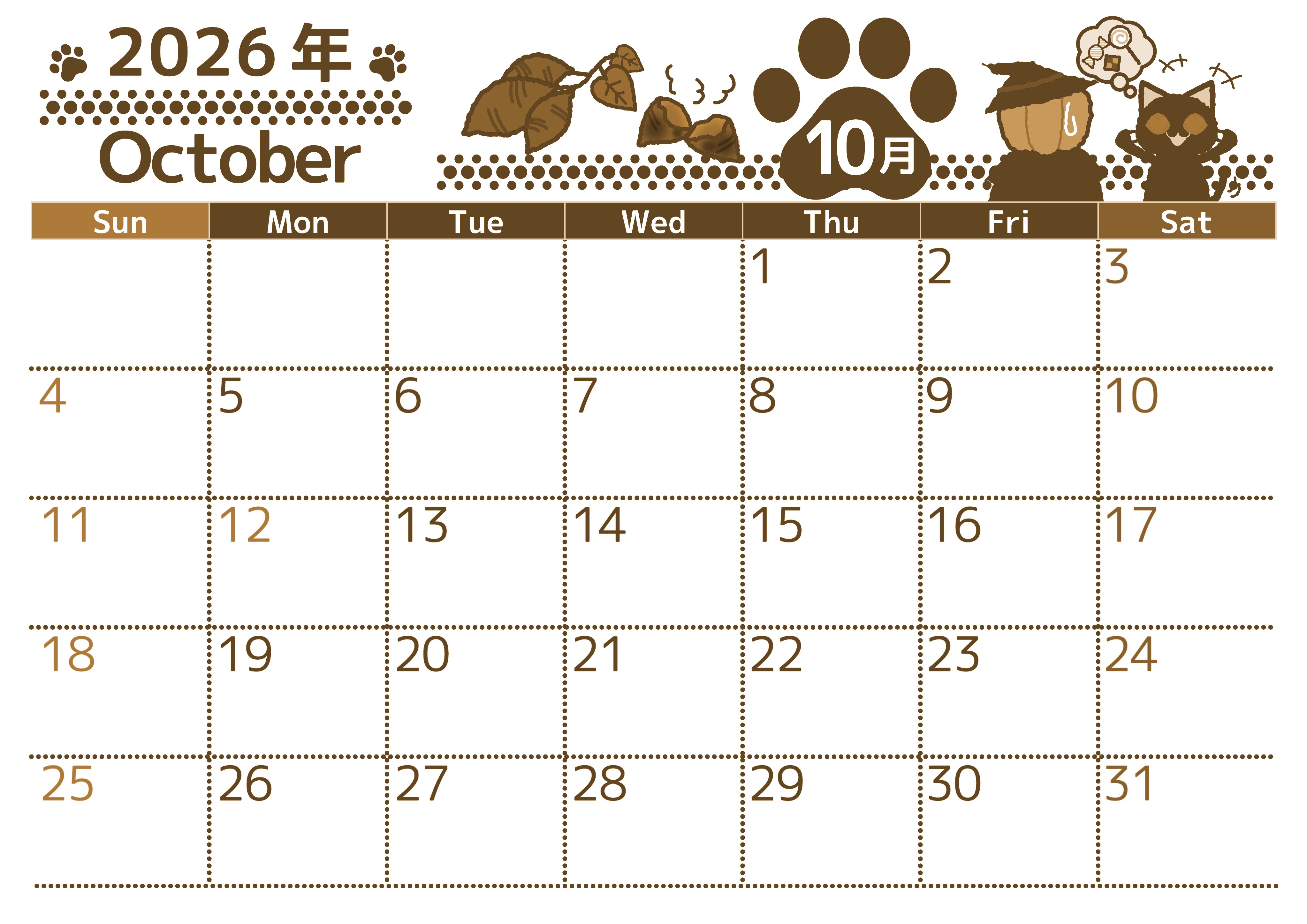 2026年10月横型レトロな日曜始まり 猫イラストのかわいいA4無料セピア調カレンダー(2026-00781000)