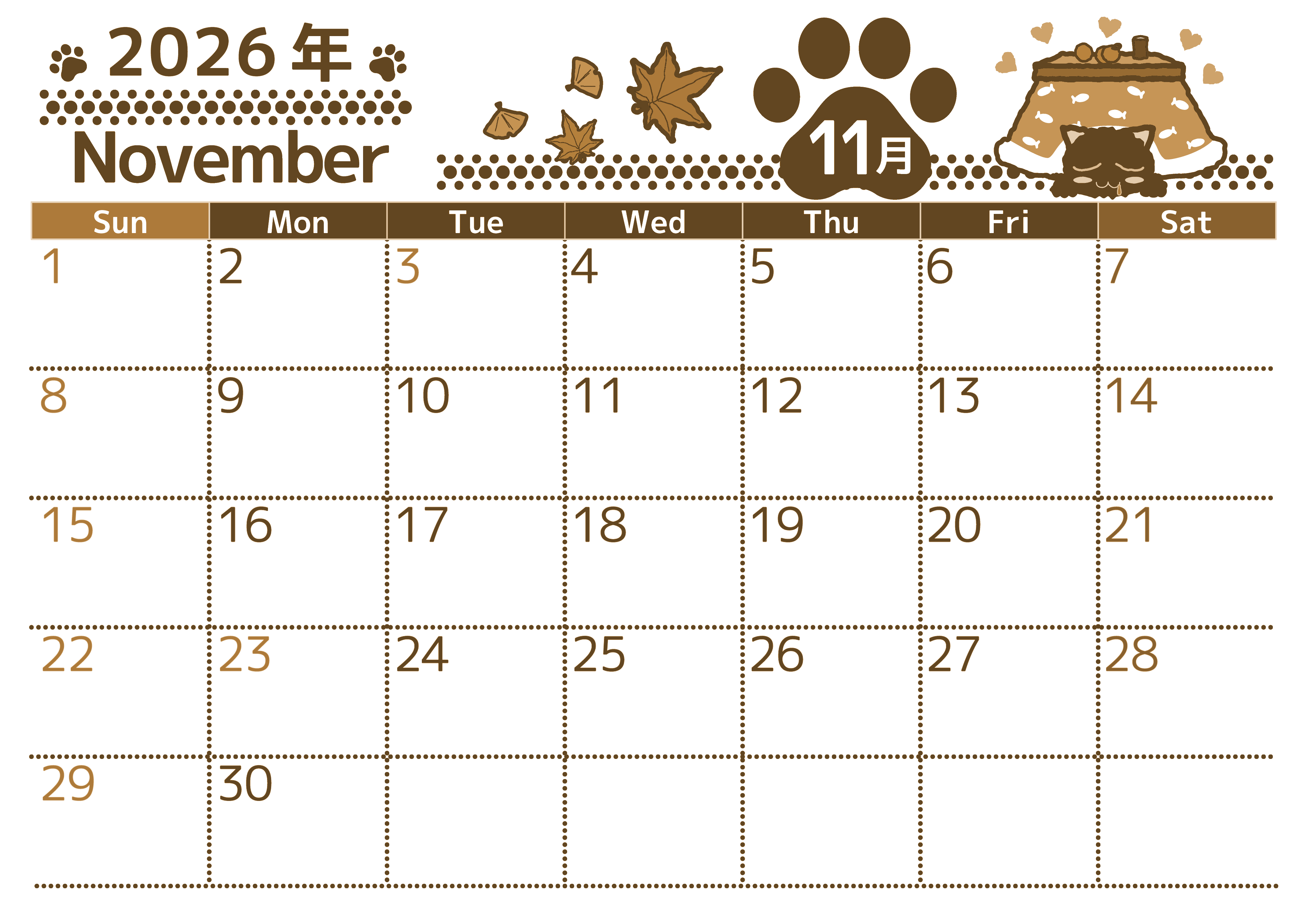 2026年11月横型レトロな日曜始まりの無料テンプレートセピア調カレンダーです。こたつで丸くなってヌクヌクとくつろいでいる猫のイラストがとてもかわいいです。寒さストレスを吹き飛ばしてくれるようなアットホームなデザインとなっています。(2026-00781100)