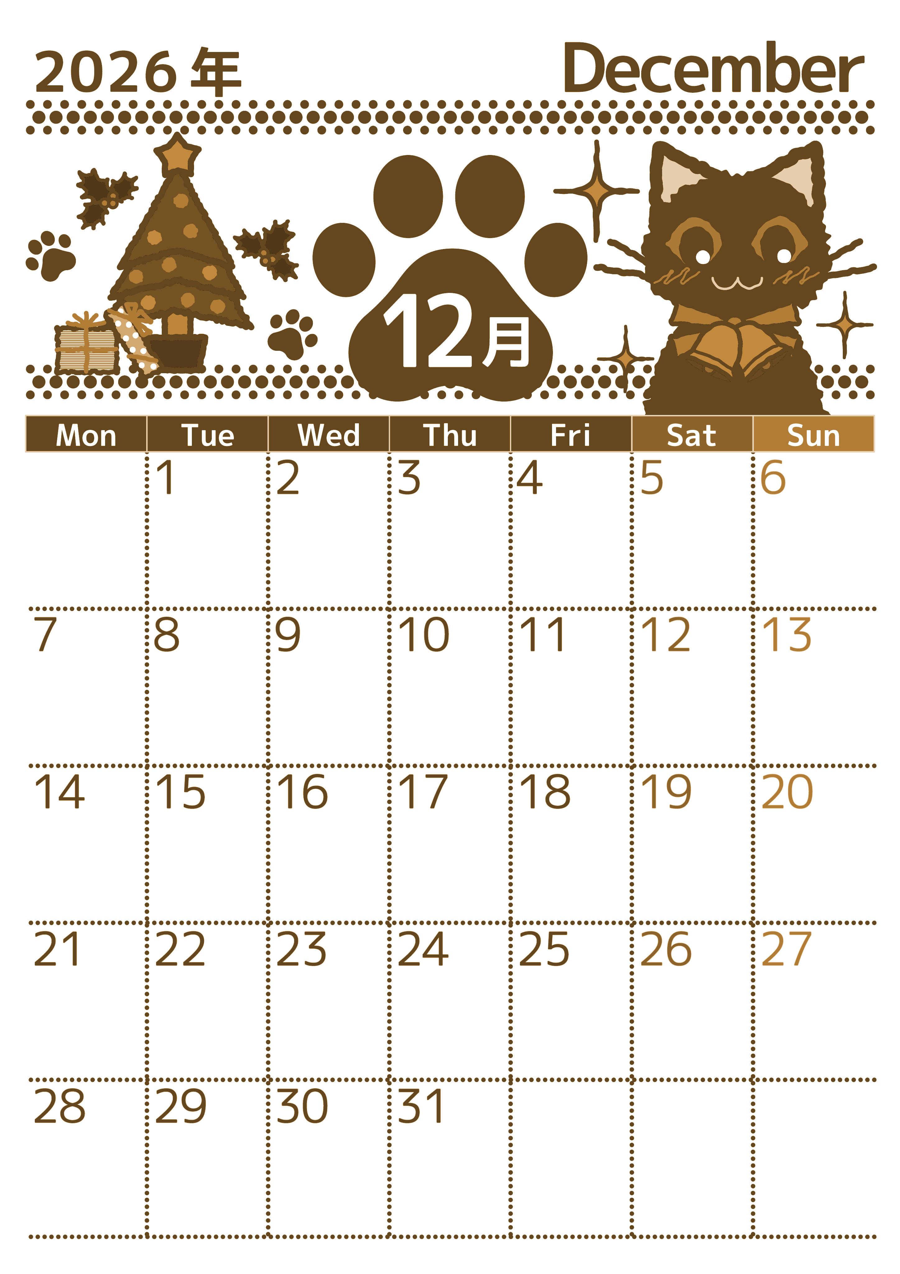 2026年12月縦型レトロな月曜始まりの無料テンプレートセピア調カレンダーです。猫が首にクリスマスの鈴をぶら下げてソワソワしている様子がとてもかわいいイラストに仕上がっています。月曜始まりでプランニングにピッタリです。(2026-00781211)