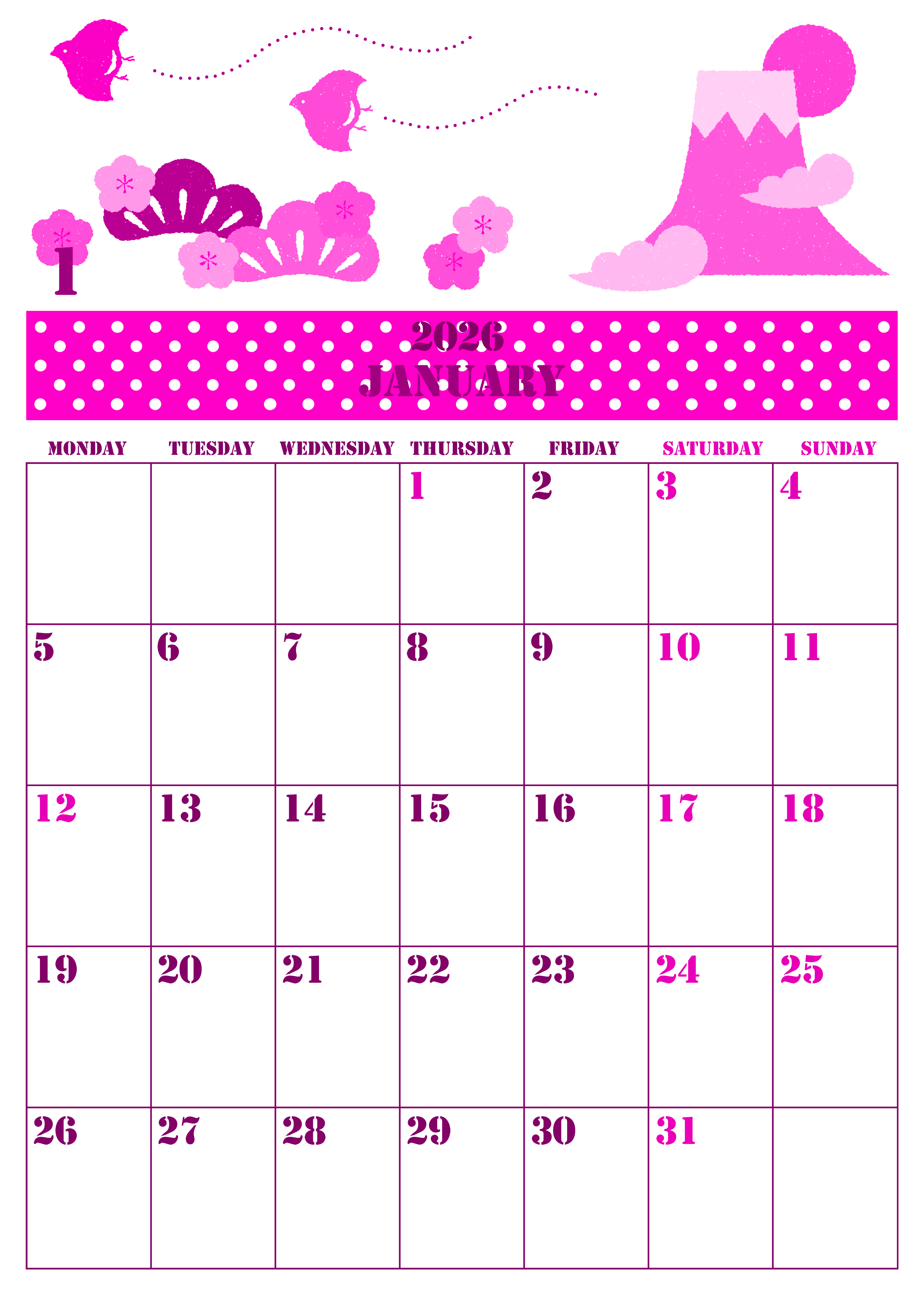 2026年1月縦型月曜始まり 便利な富士山イラストのかわいいA4無料ピンクのカレンダー(2026-00790111)