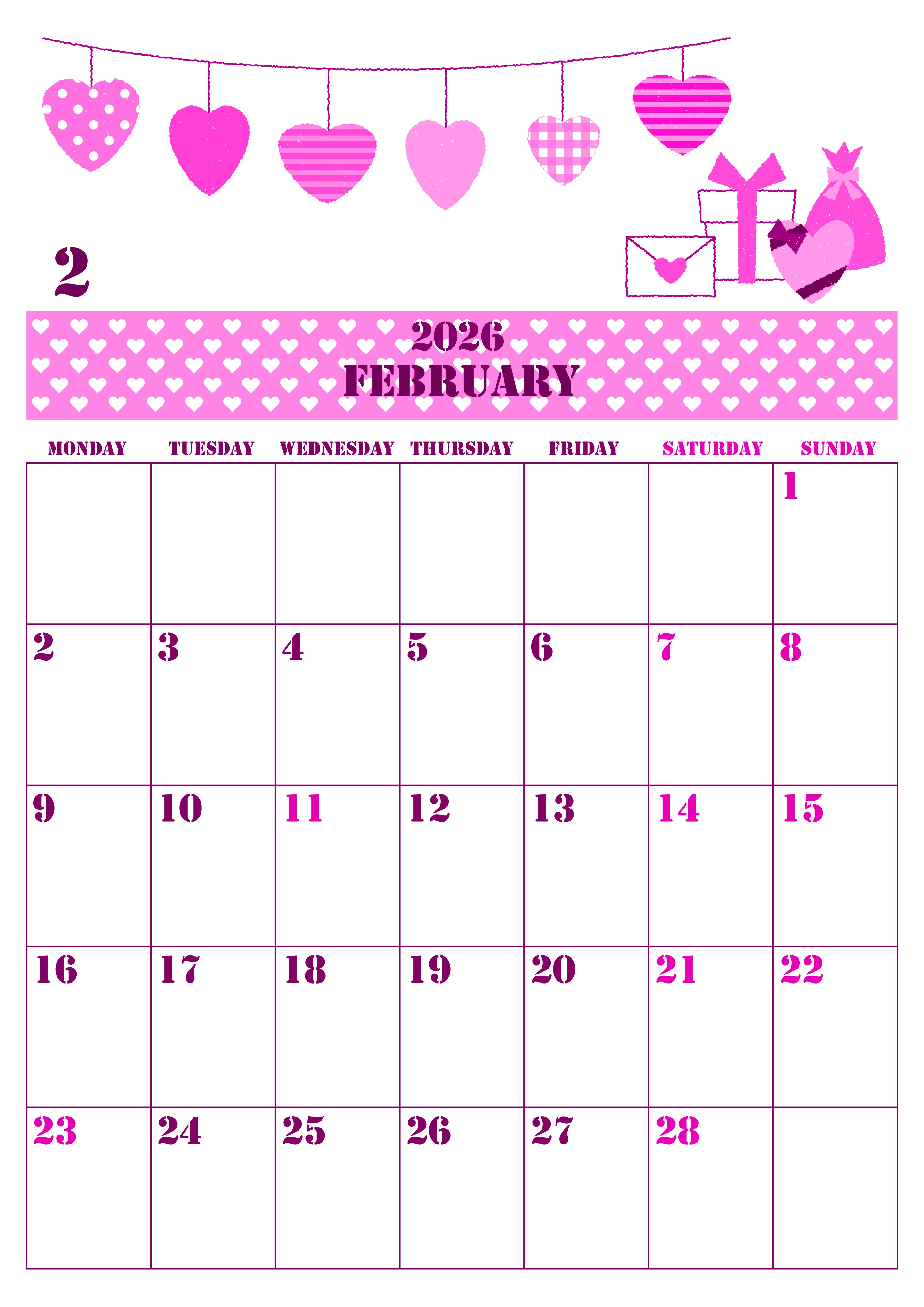 2026年2月縦型月曜始まりの無料テンプレートピンクのカレンダーです。月曜始まりなので家族の予定を立てるのにとても適しているフリー素材です。曜日によって文字の色分けがされているので読み違いを防げる縦型ピンクのカレンダーでイラストもかわいいです。(2026-00790211)