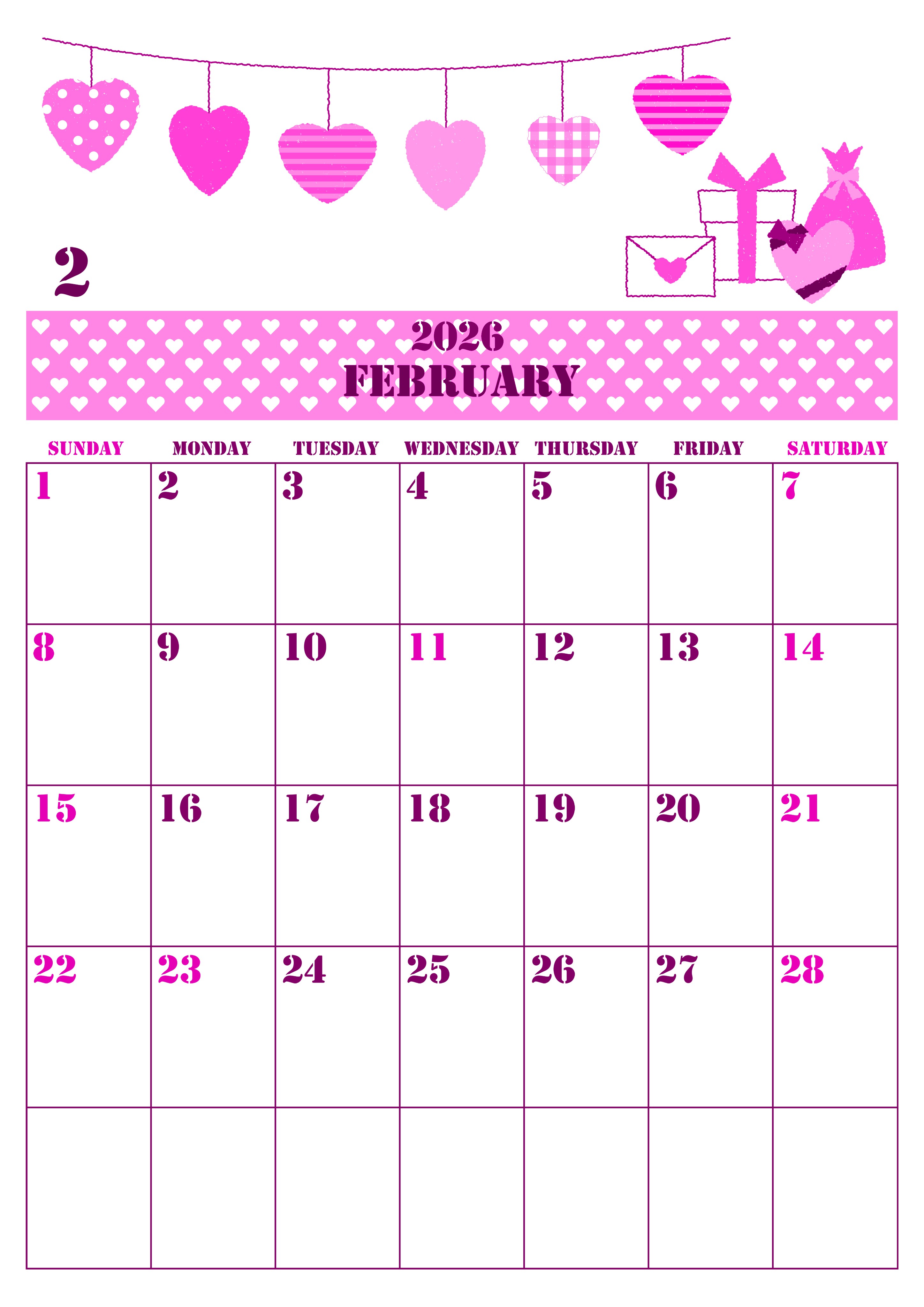 2026年・無料のカレンダーテンプレート 2026年2月縦型日曜始まり ラブレターイラストのかわいいA4無料ピンクのカレンダー(2026-00790210) 素材状デザイン王 2025年4月3日 2026年2月縦型日曜始まりの無料テンプレートピンクのカレンダーです。ハートがいっぱい溢れているバレンタインの要素が詰まった白紙に印刷しても充分かわいい縦型フリー素材ピンクのカレンダーです。(2026-00790210) 2月 縦型のカレンダー 日曜始まり ピンク カレンダーデザイン-0079