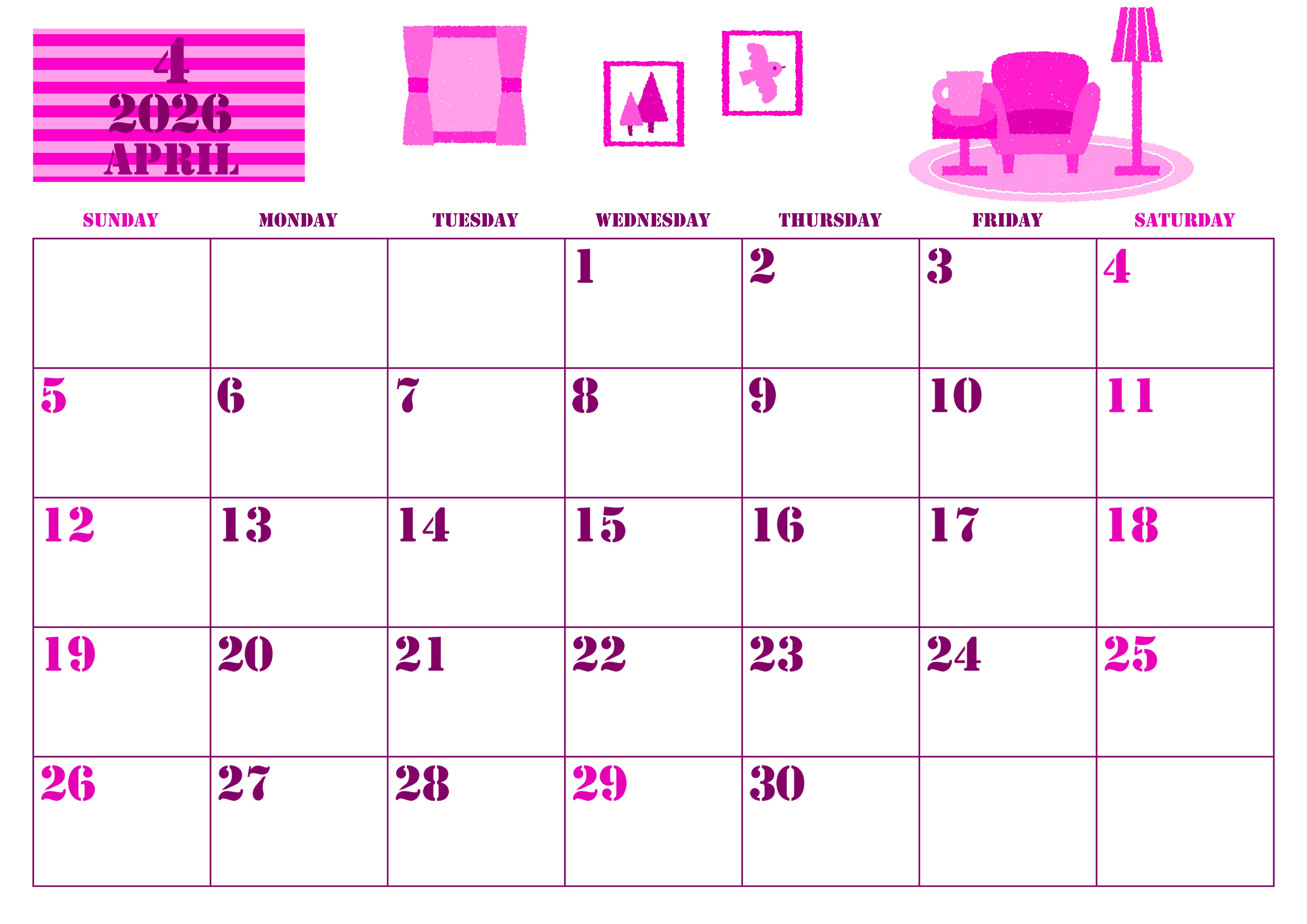 2026年4月横型日曜始まりの無料テンプレートピンクのカレンダーです。ソファやカーテンといったかわいい新生活を連想させるイラストがかわいいシンプルな白を基調としたスッキリ見やすいピンクのカレンダー素材となっています。(2026-00790400)