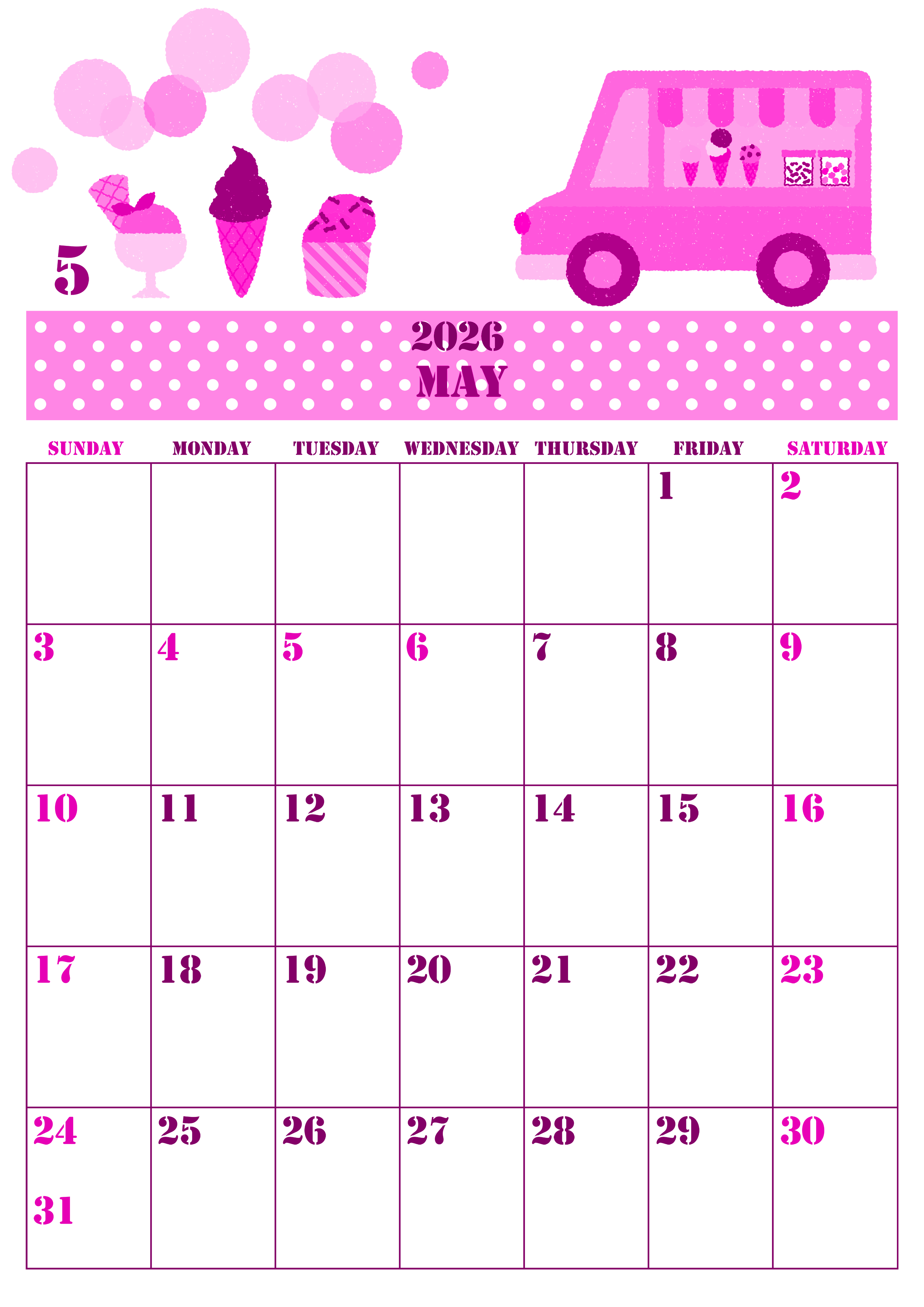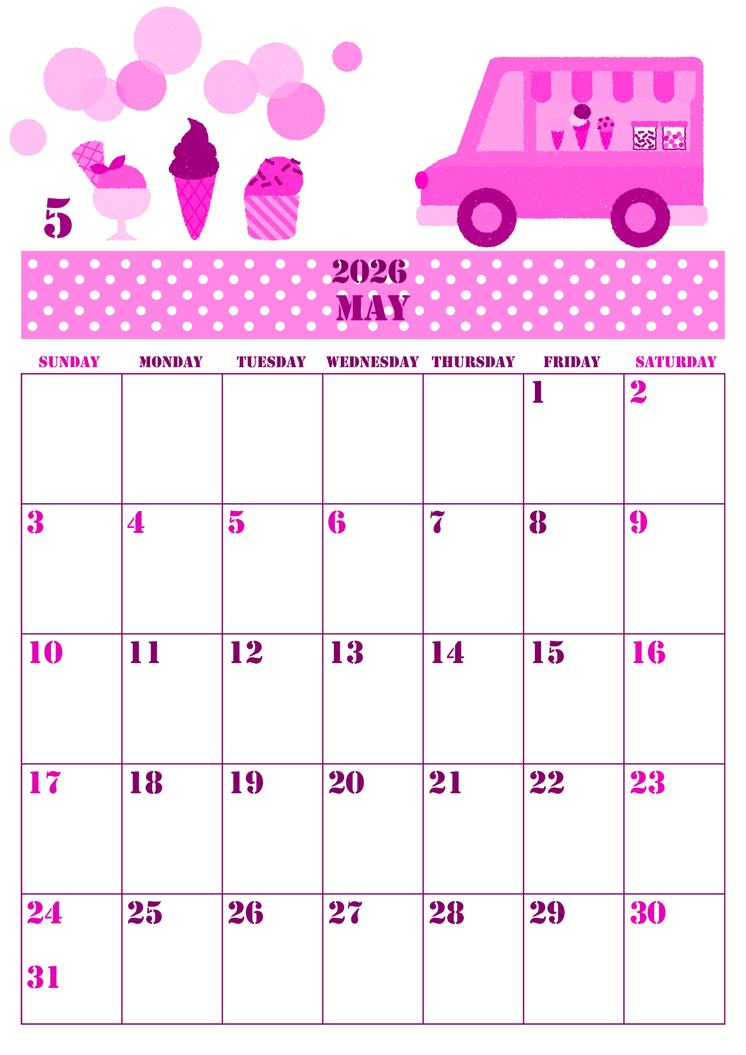 2026年5月縦型日曜始まりの無料テンプレートピンクのカレンダーです。アイスクリームを運ぶトラックのイラストが楽しいイベントを連想させるような使いたくなるかわいい無料のピンクのカレンダーとなっています。(2026-00790510)