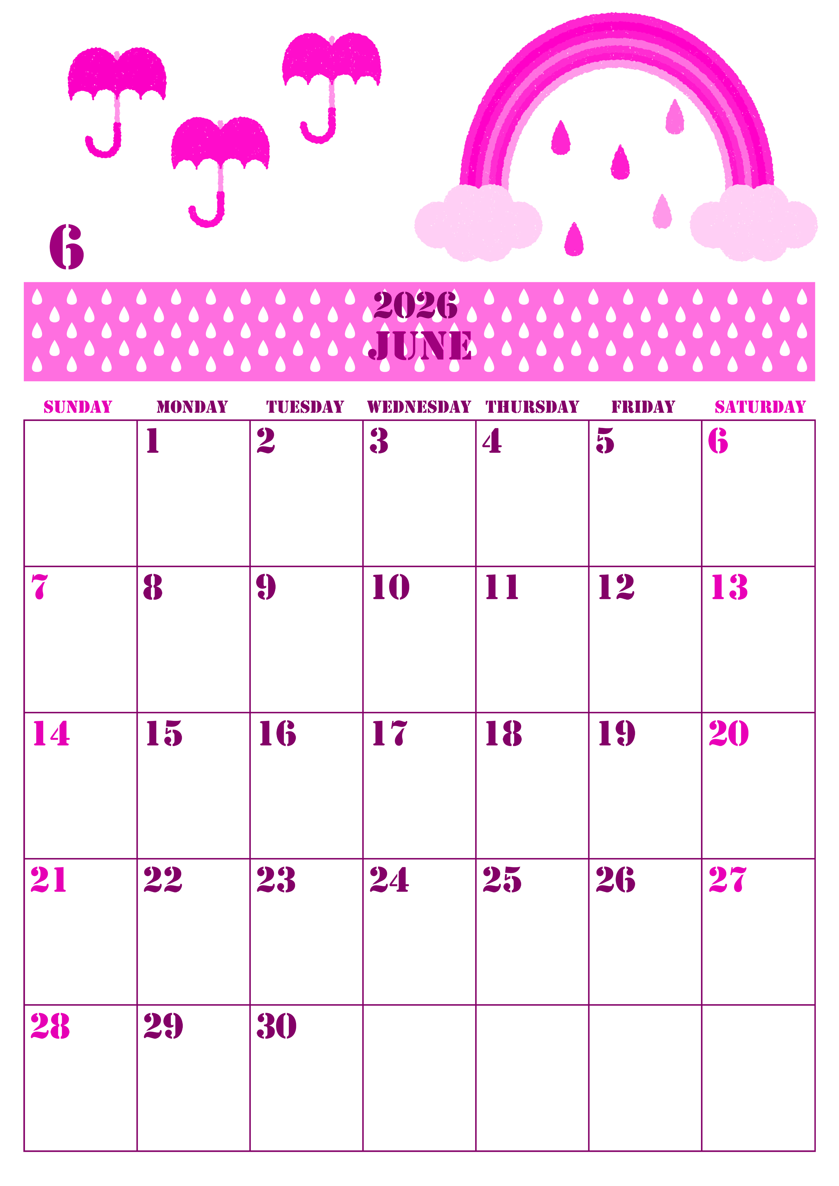 2026年6月縦型日曜始まりの無料テンプレートピンクのカレンダーです。傘や虹のイラストがほのぼのとした気持ちにさせてくれるかわいいイラストです。白紙に印刷をしてすぐに使えるピンクのカレンダーなので便利です。(2026-00790610)