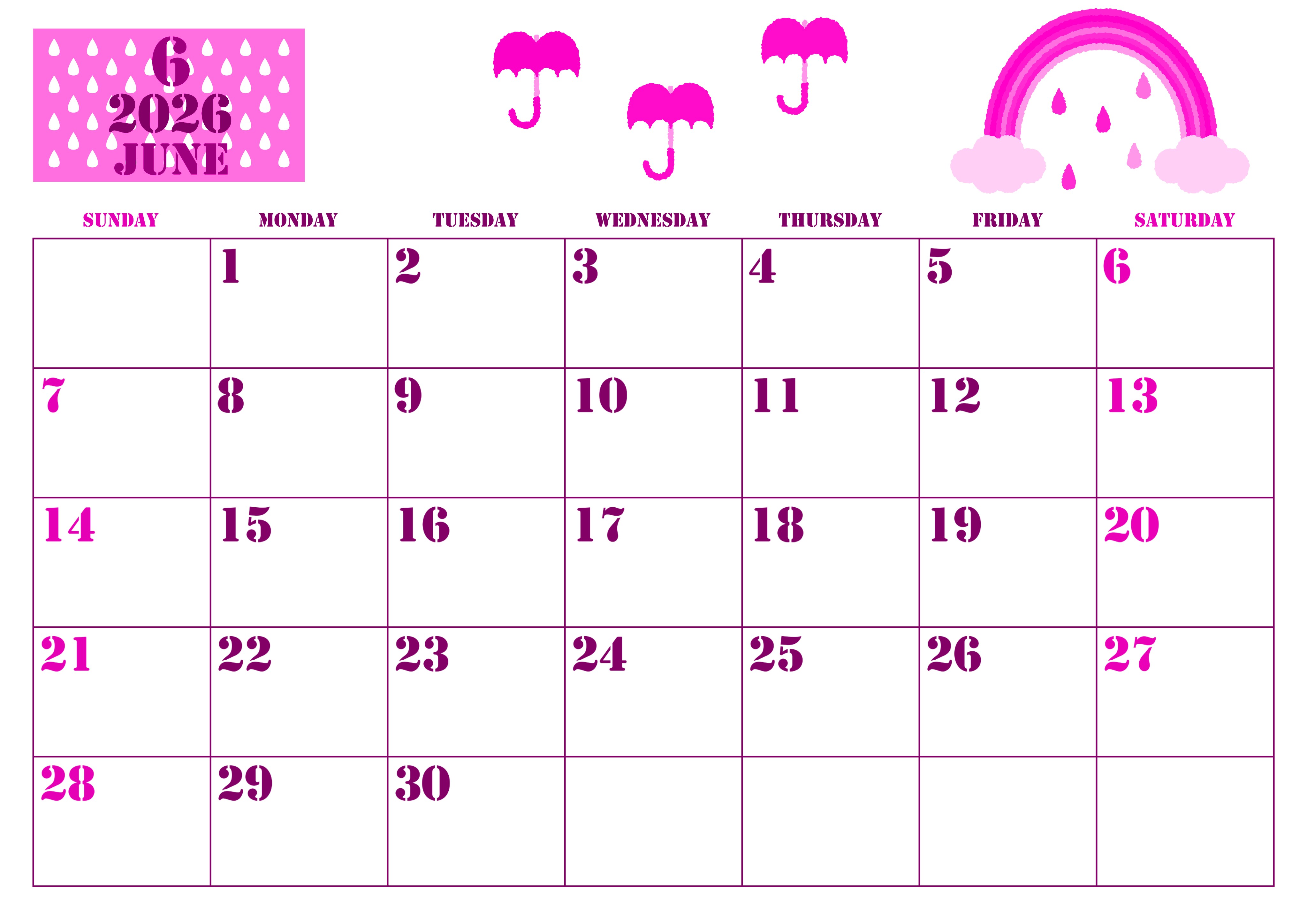 2026年・無料のカレンダーテンプレート 2026年6月横型日曜始まり 虹イラストのかわいいA4無料ピンクのカレンダー(2026-00790600) 素材状デザイン王 2025年4月3日 2026年6月横型日曜始まりの無料テンプレートピンクのカレンダーです。虹やパラソルのイラストがポップでかわいい無料でダウンロードを行える使いやすくて便利なピンクのカレンダー無料素材です。(2026-00790600) 6月 横型のカレンダー 日曜始まり ピンク カレンダーデザイン-0079
