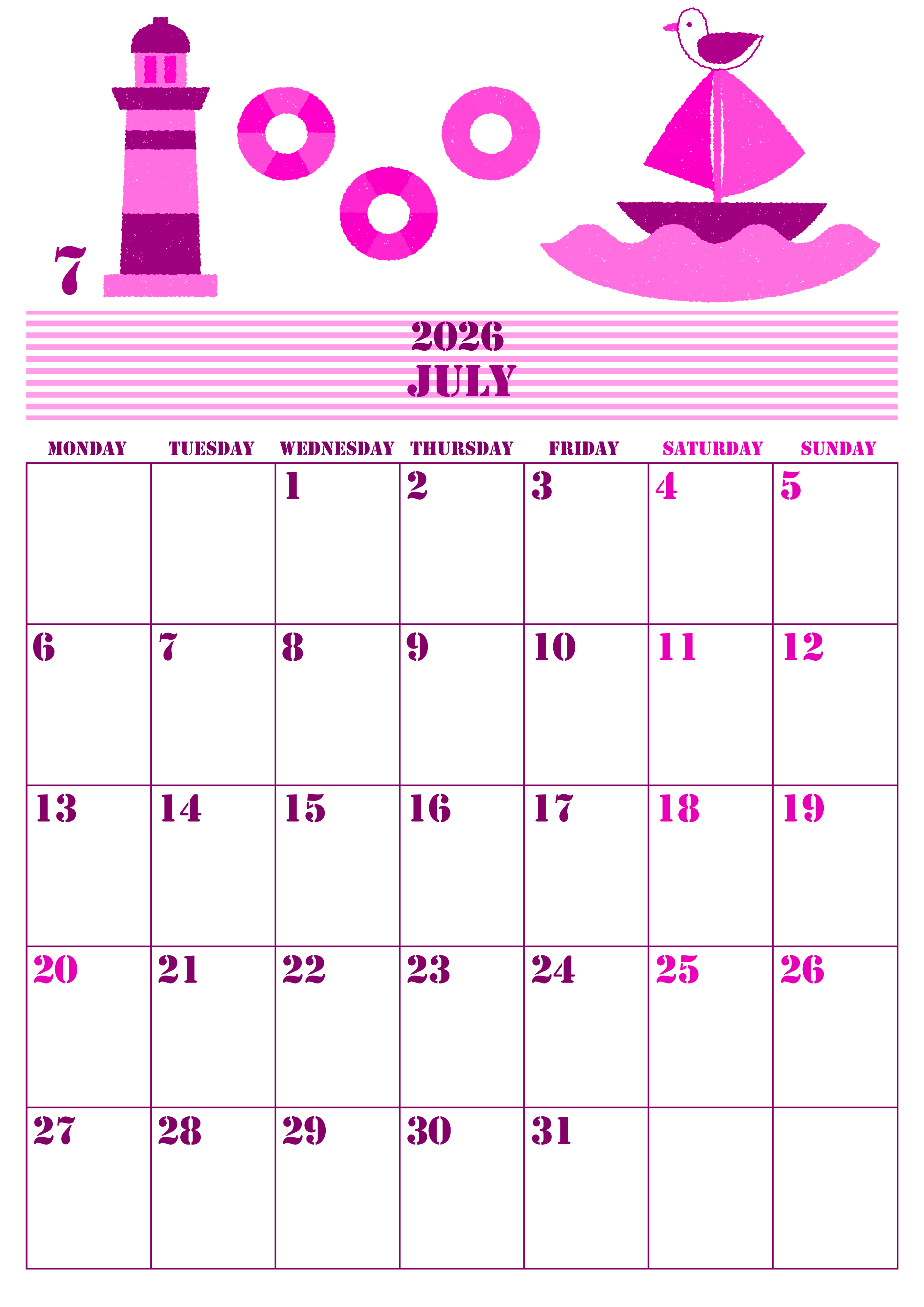 2026年7月縦型月曜始まりの無料テンプレートピンクのカレンダーです。月曜始まりピンクのカレンダーが欲しいという人に向いている無料素材です。イラストはマリンな澄んだテイストでかわいいポップ調となっています。(2026-00790711)