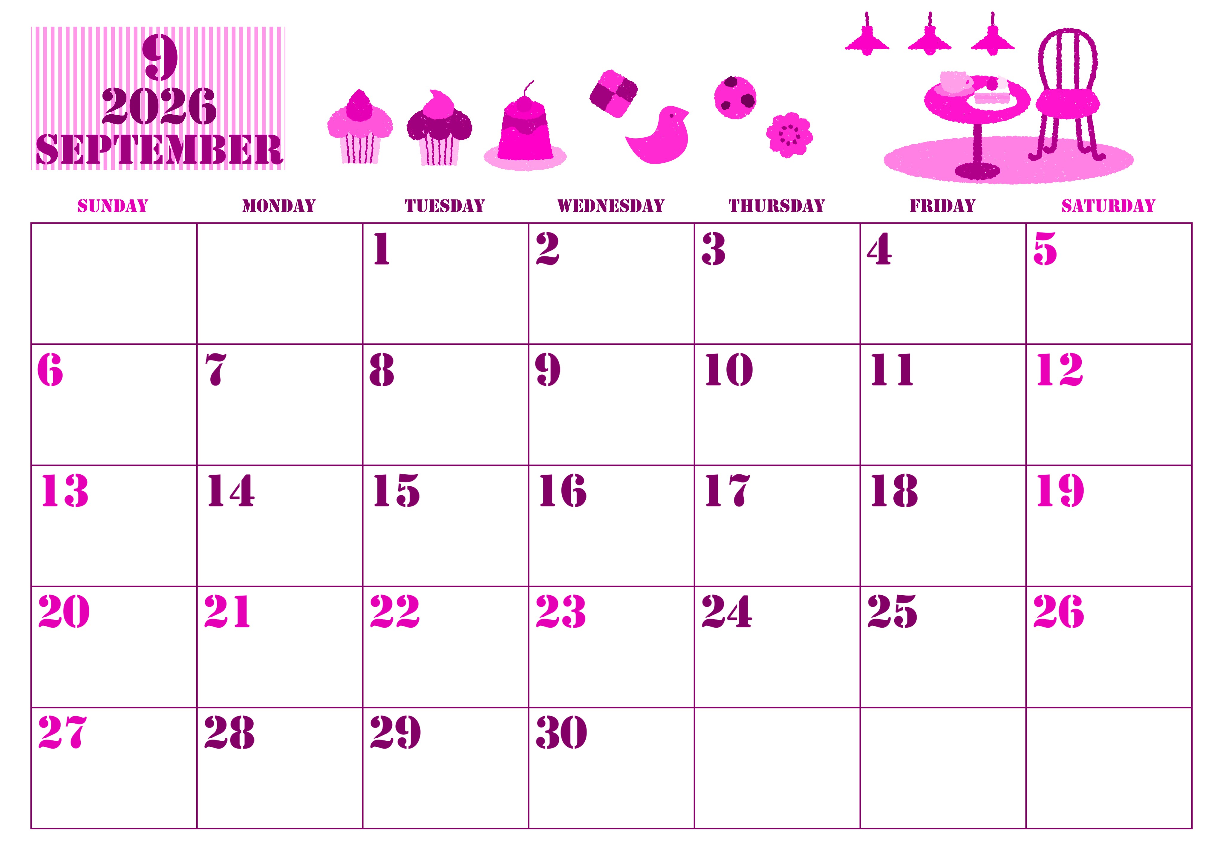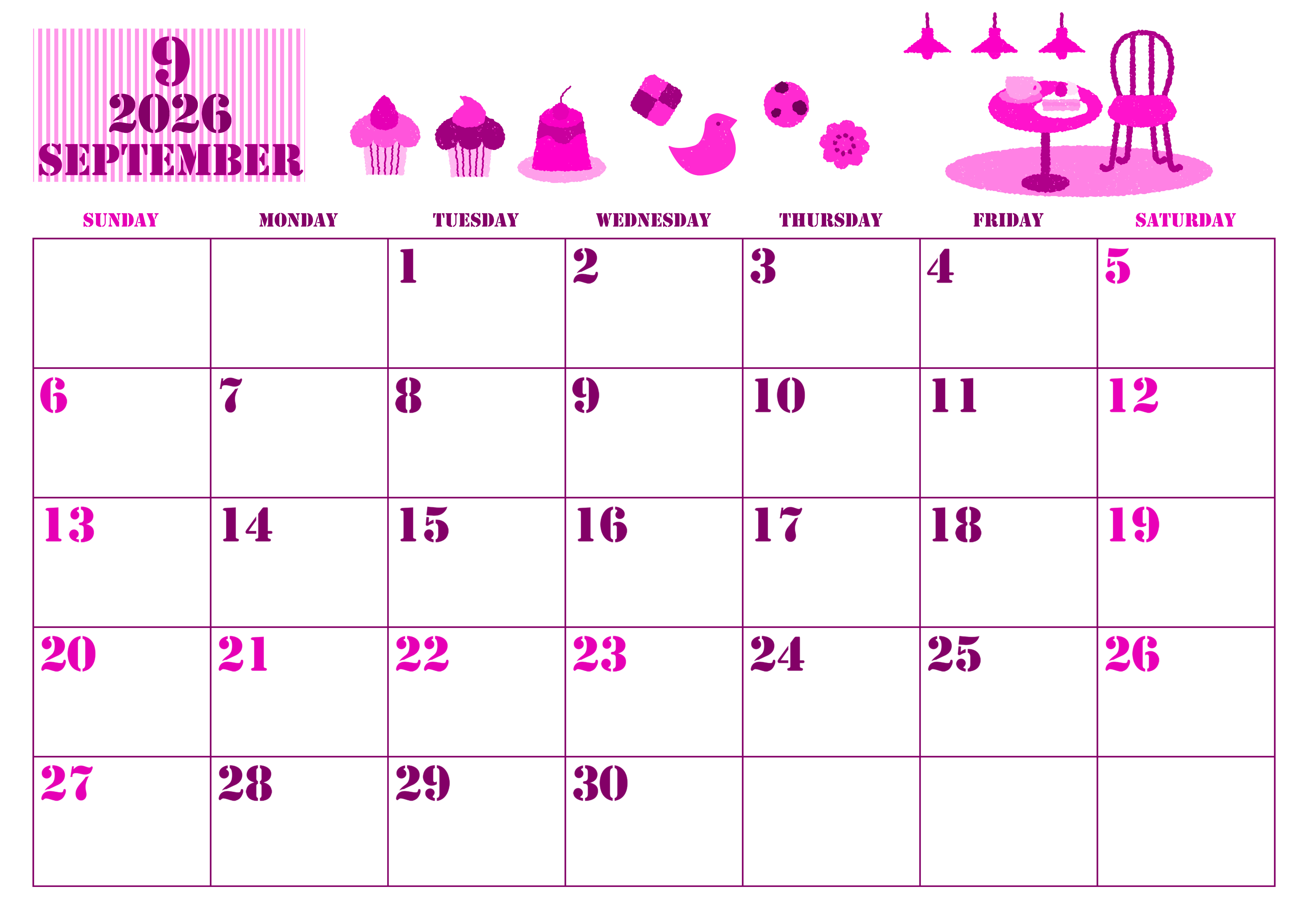 2026年9月横型日曜始まりの無料テンプレートピンクのカレンダーです。食欲の秋を連想させるようなスイーツやカフェをテーマとしたイラストがガーリーでかわいい使いやすいピンクのカレンダーを用意しました。(2026-00790900)