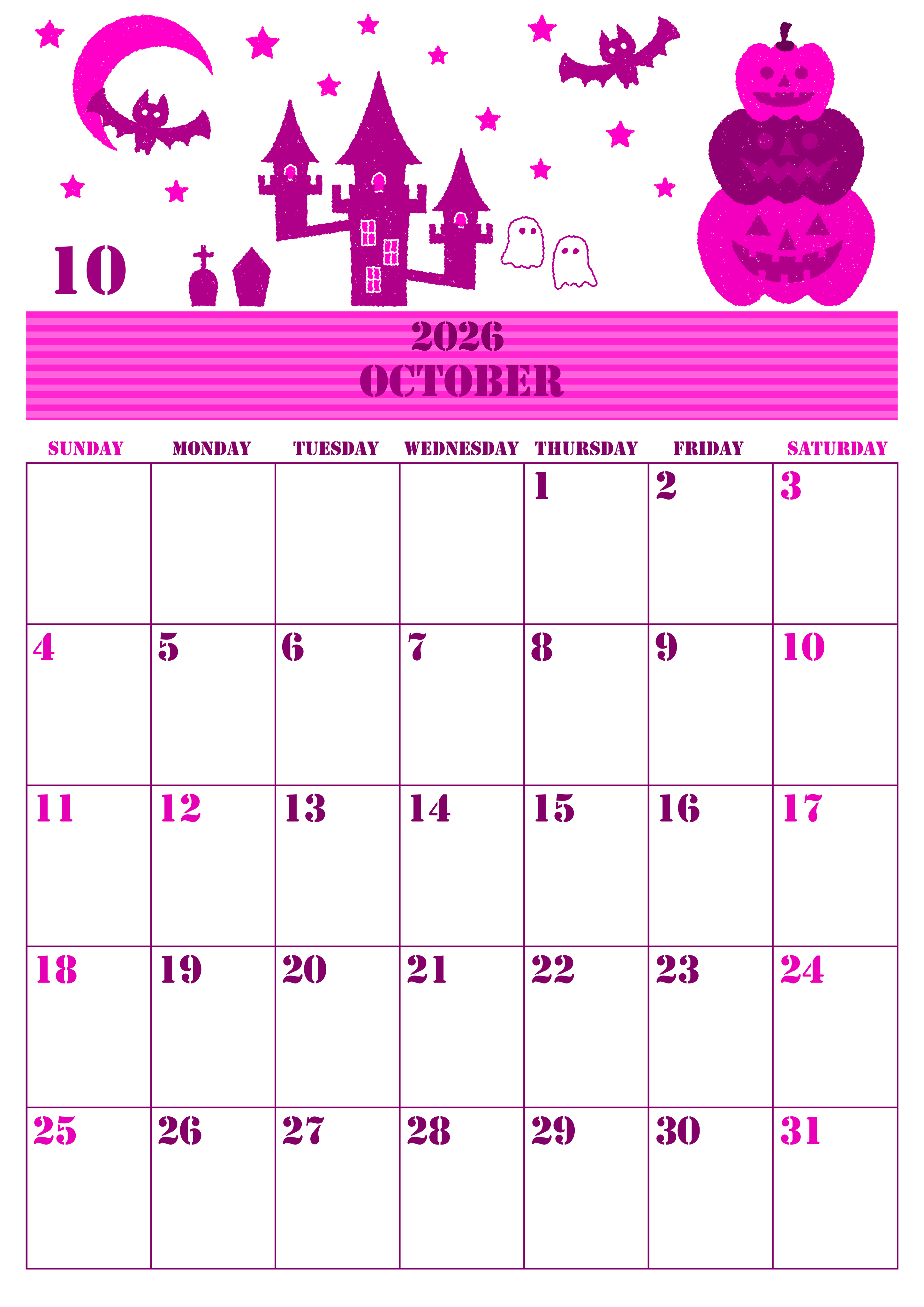 2026年10月縦型日曜始まりの無料テンプレートピンクのカレンダーです。ハロウィンといえばカボチャですが、それだけでなくお化け屋敷やコウモリのイラストもバッチリ描かれているかわいい素材となっています。(2026-00791010)