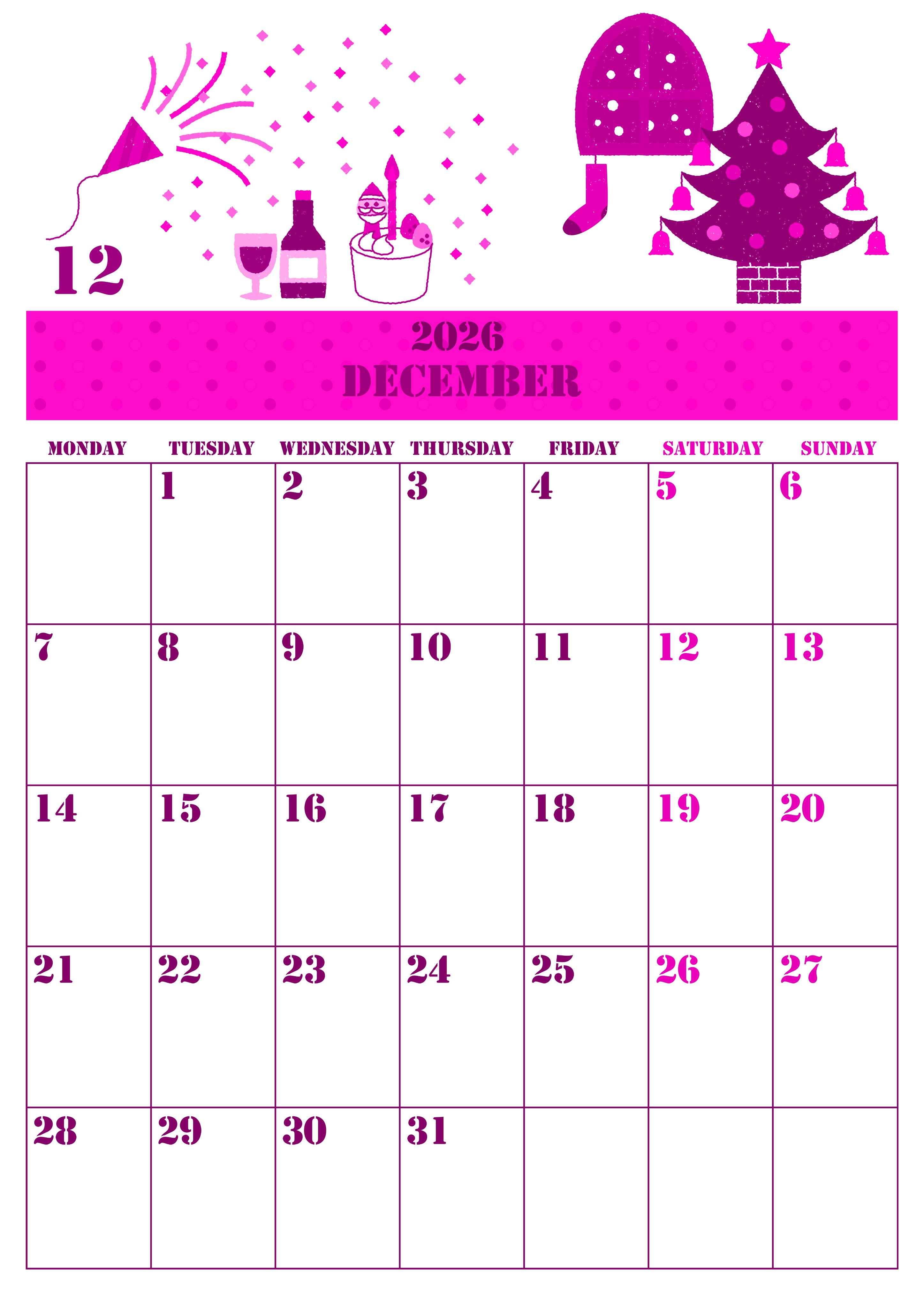 2026年12月縦型月曜始まりの無料テンプレートピンクのカレンダーです。パーティーの盛り上がりが伝わってくるようなかわいいイラストです。月曜始まりで文字の色分けがされているので見やすい利便性の高いピンクのカレンダーとなっています。(2026-00791211)