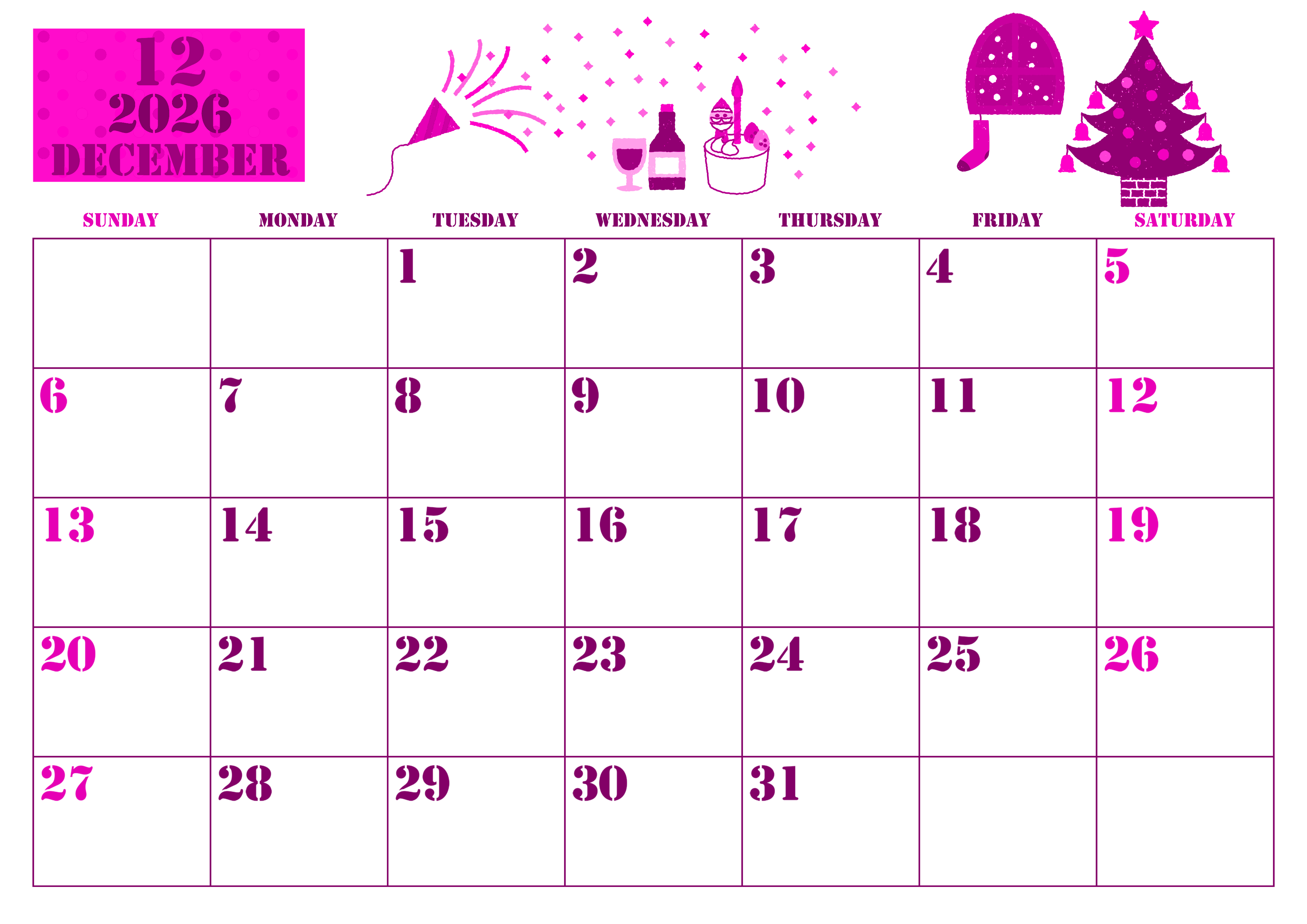 2026年12月横型日曜始まりの無料テンプレートピンクのカレンダーです。クラッカーがパーンとはじけているパーティーの様子が描かれているかわいいイラストが予定を立てる側を楽しませてくれます。A4用紙にプリントアウトしましょう。(2026-00791200)