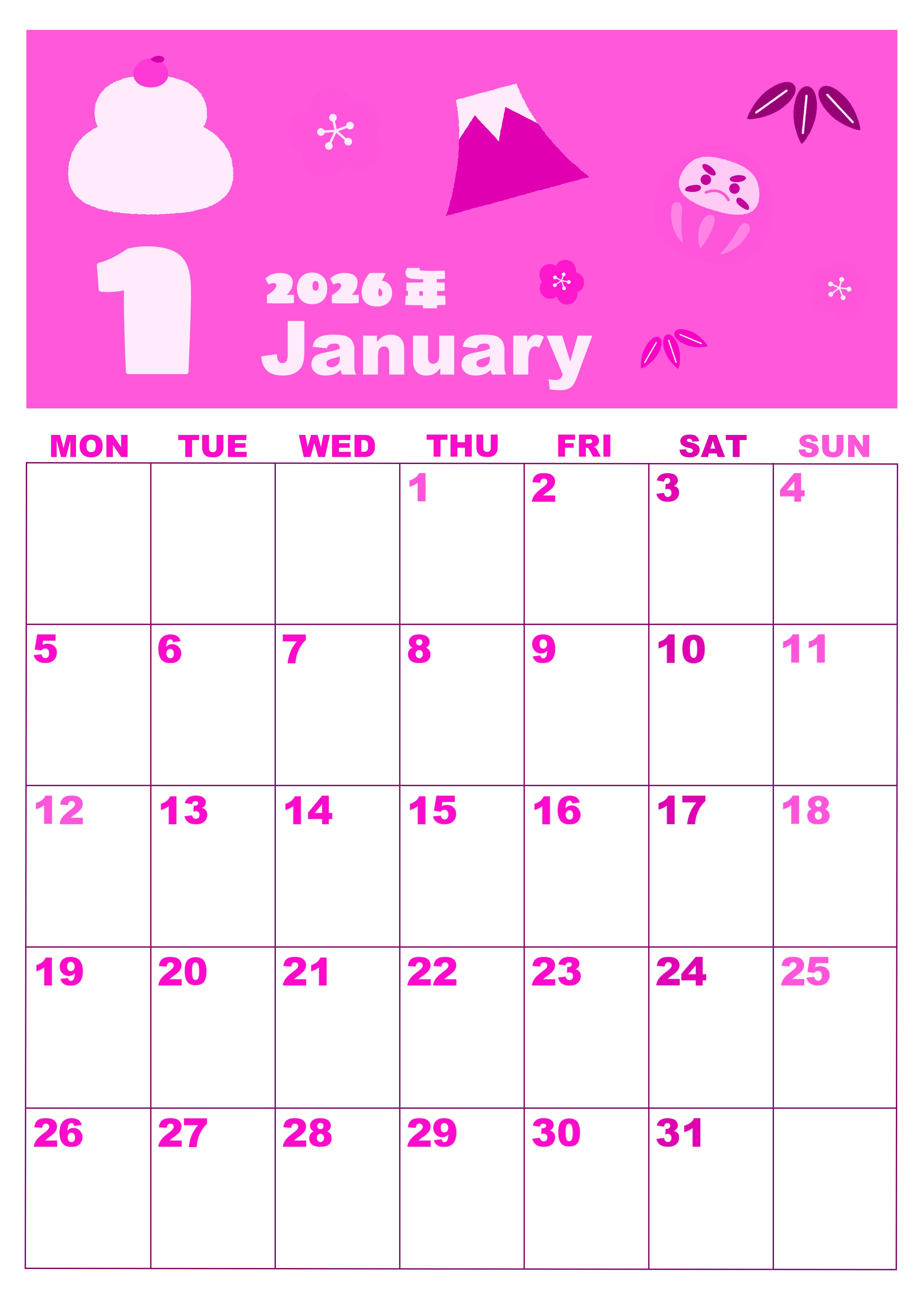 2026年1月縦型月曜始まりです。イラストは和風とかわいいが共存しています。スケジュールを書き込みする部分は白色なので使いやすいピンクのカレンダーです。曜日も色分けされていて日付の文字は少し薄い色合いとどこまでもかわいい素材なのでダウンロードをおすすめします。(2026-00800111)