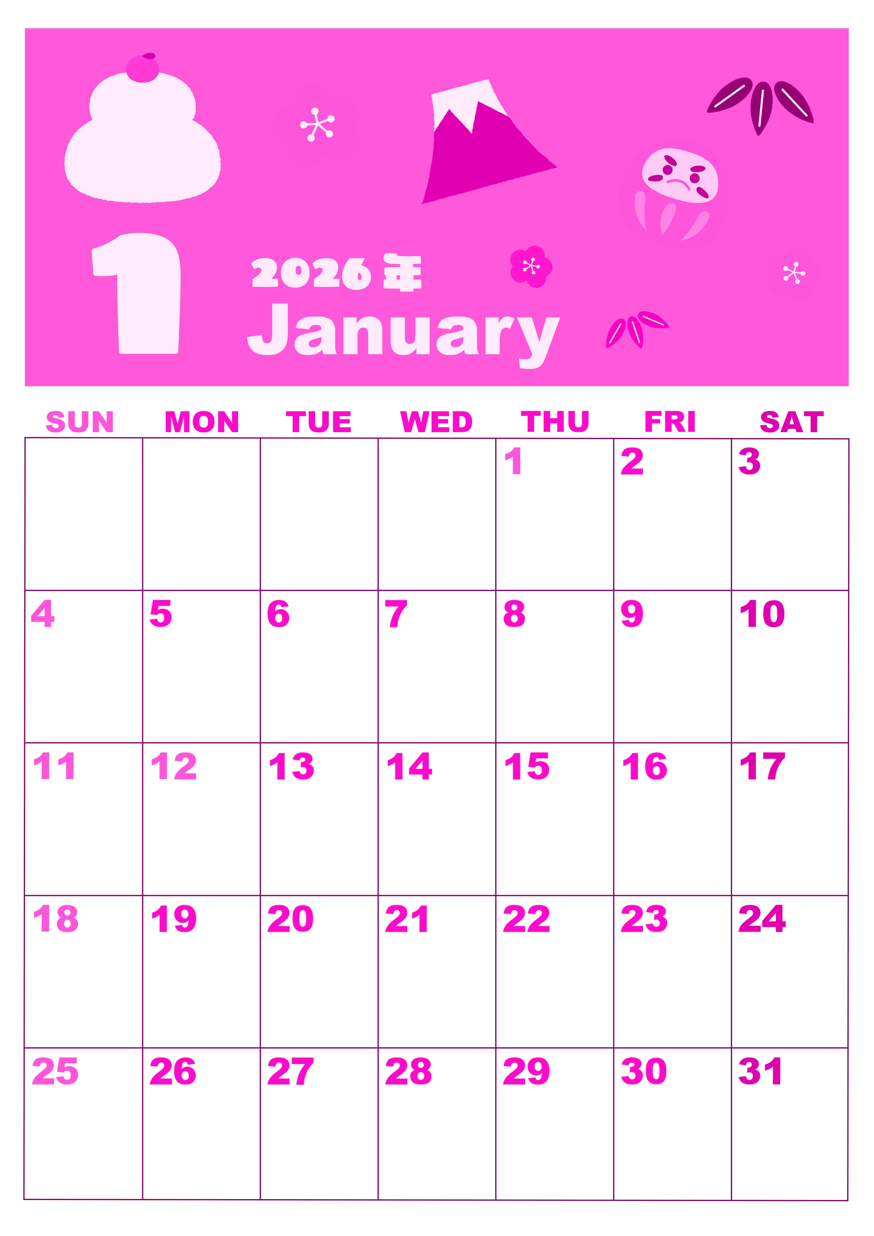 2026年1月縦型日曜始まりです。イラストは和風を前面におしているもののコロンとかわいい雰囲気を忘れていないユニークなフリー素材です。かがみもちとだるまと富士山と梅と竹と幸を呼び寄せる素材が目白押しのポップな無料でダウンロードを行えるピンクのカレンダーです。(2026-00800110)