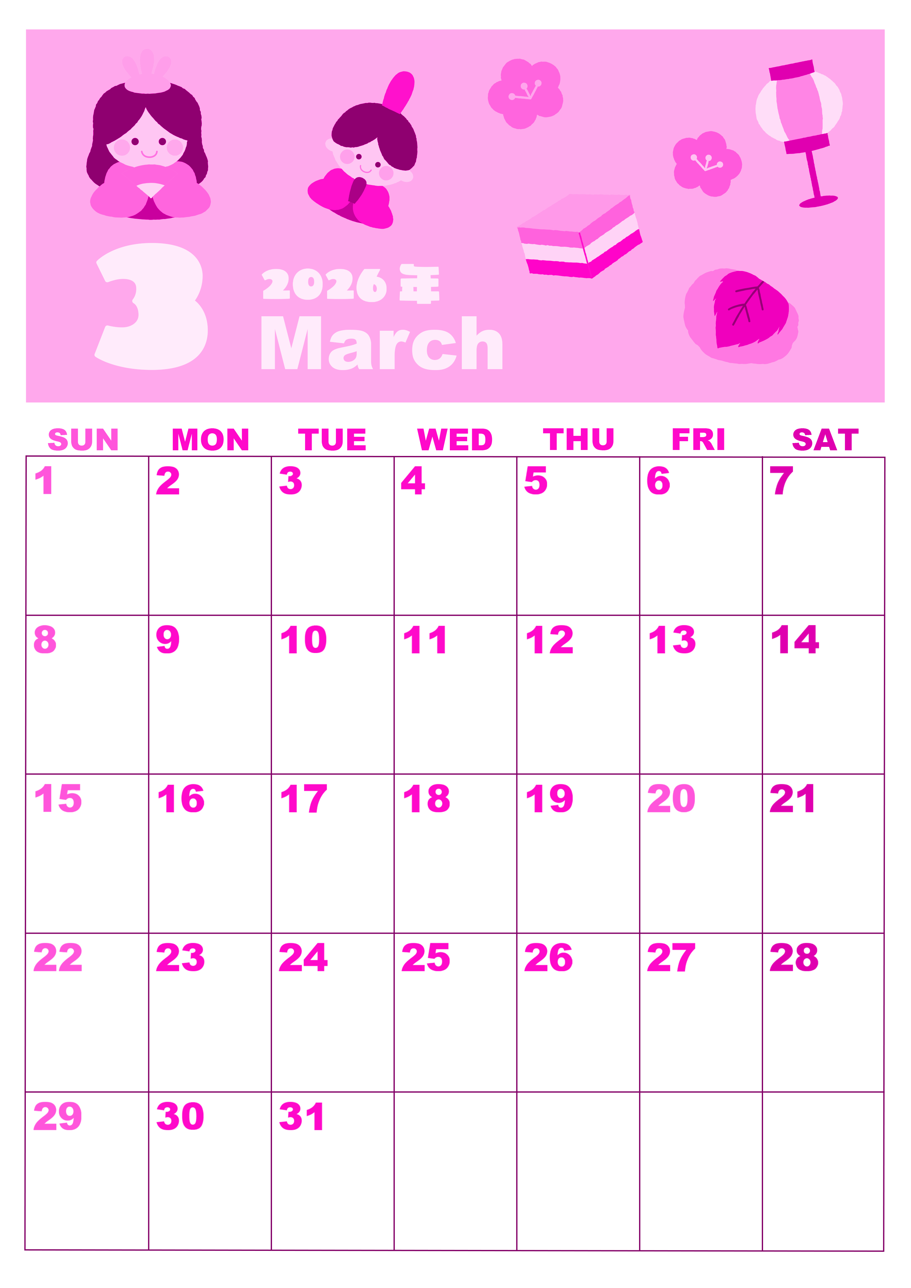 2026年3月縦型日曜始まり ぼんぼりイラストのかわいいA4無料ピンクのカレンダー(2026-00800310)