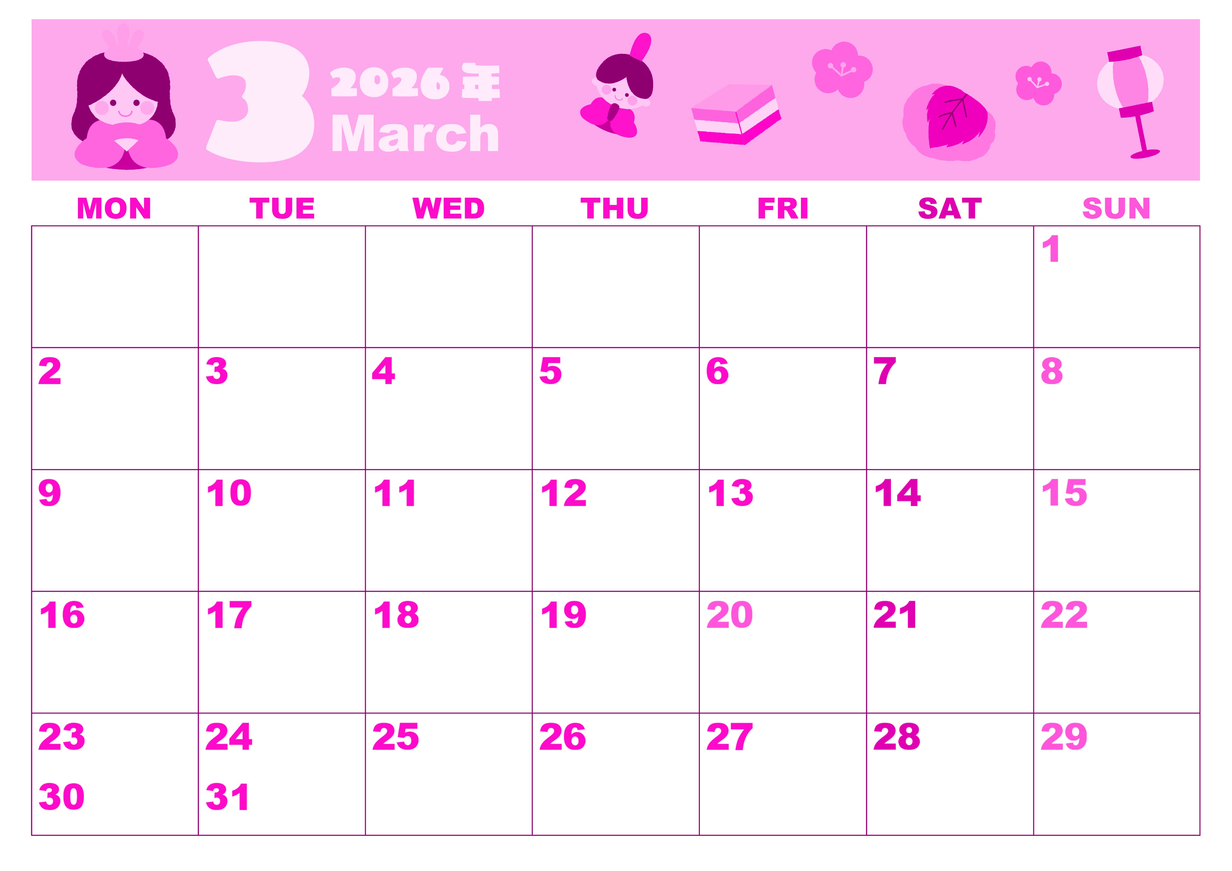 2026年3月横型月曜始まり ぼんぼりイラストのかわいいA4無料ピンクのカレンダー(2026-00800301)
