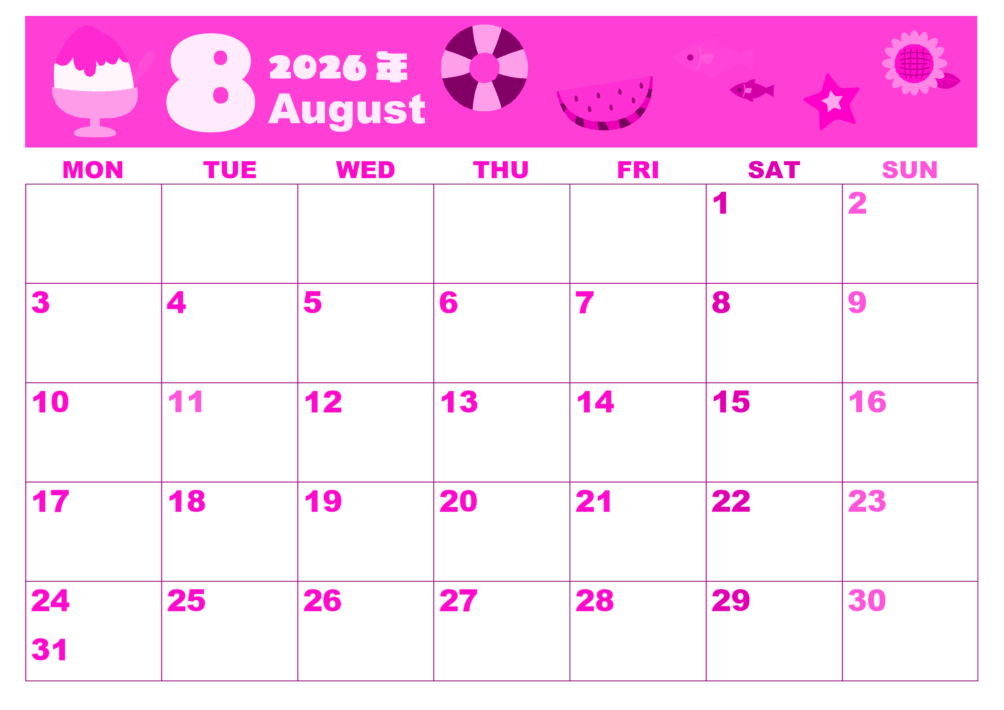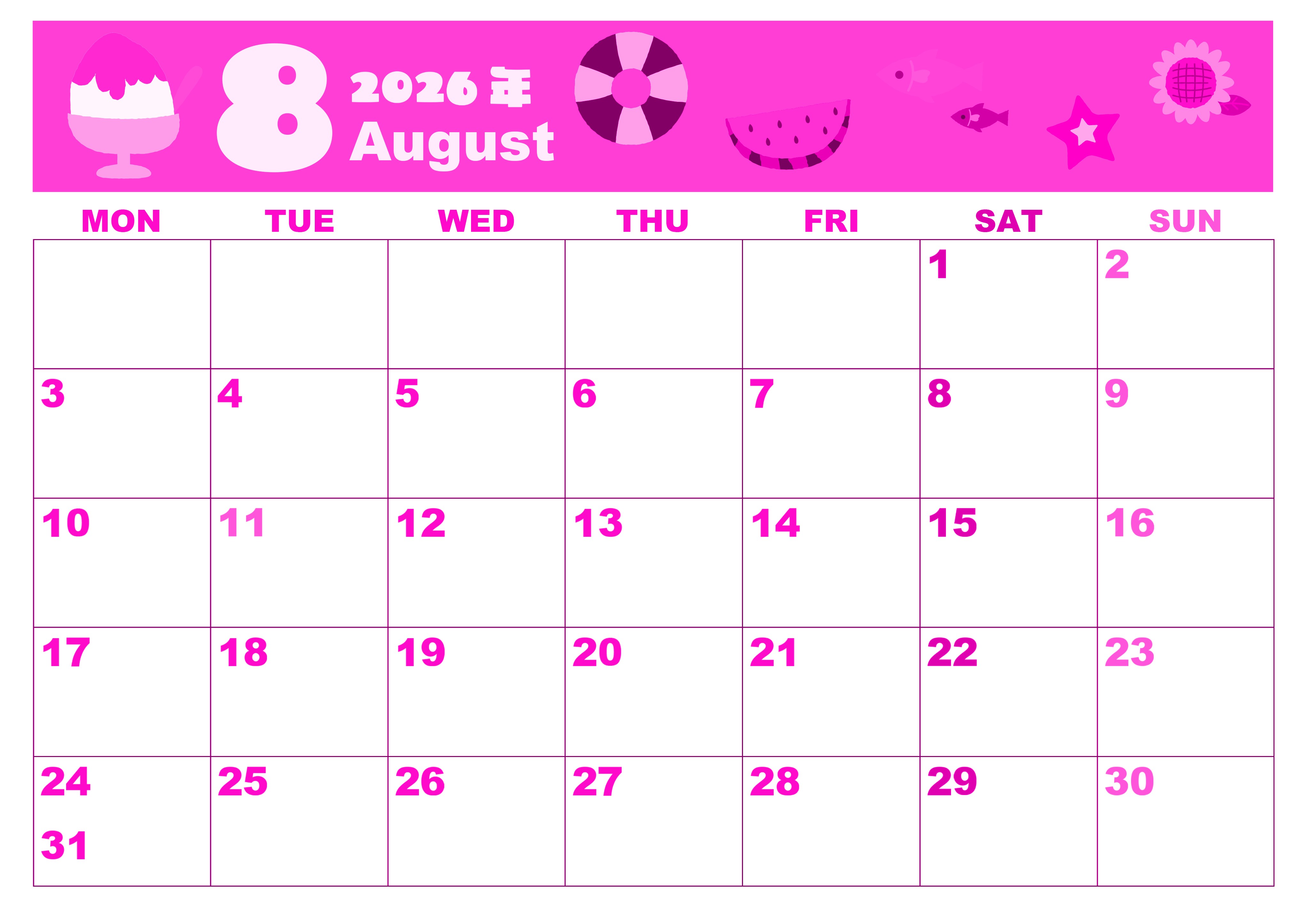 2026年8月横型月曜始まり 夏休みイラストのかわいいA4無料ピンクのカレンダー(2026-00800801)