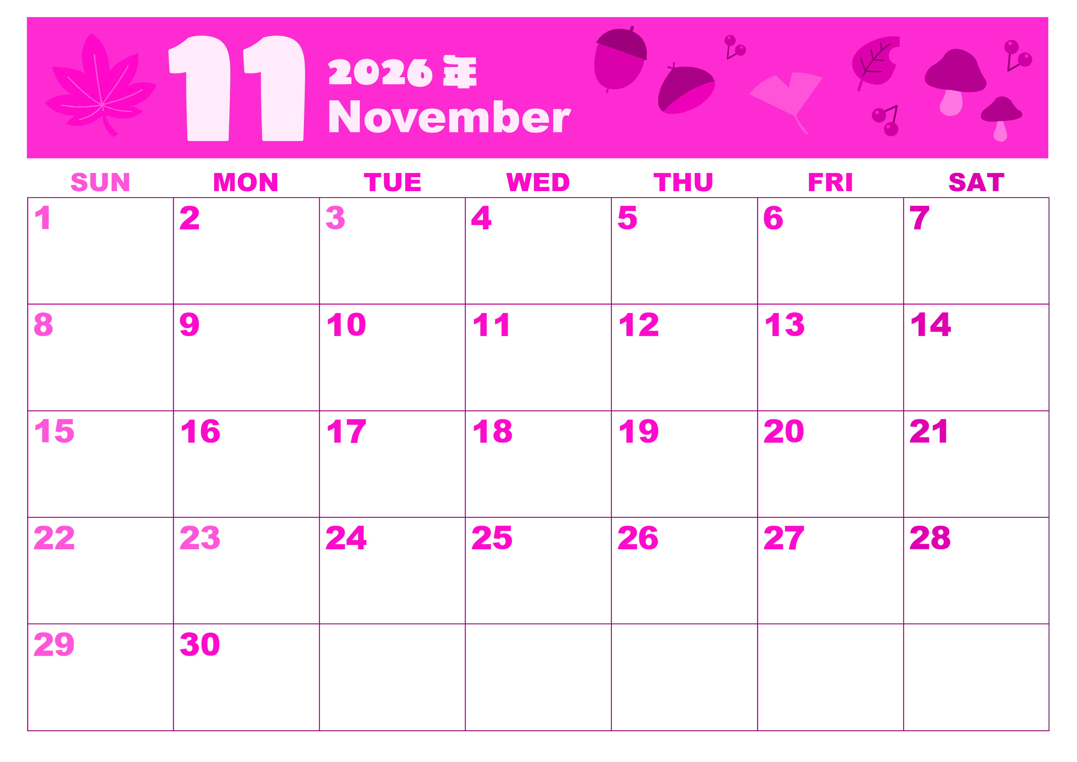 2026年・無料のカレンダーテンプレート 2026年11月横型日曜始まり どんぐりイラストのかわいいA4無料ピンクのカレンダー(2026-00801100) 素材状デザイン王 2025年4月3日 2026年11月横型日曜始まりの無料テンプレートピンクのカレンダーです。きのこやどんぐりやいちょうやもみじが癒し系のかわいい雰囲気を醸し出している秋の世界観満載のイラストに仕上がっています。(2026-00801100) 11月 横型のカレンダー 日曜始まり ピンク カレンダーデザイン-0080