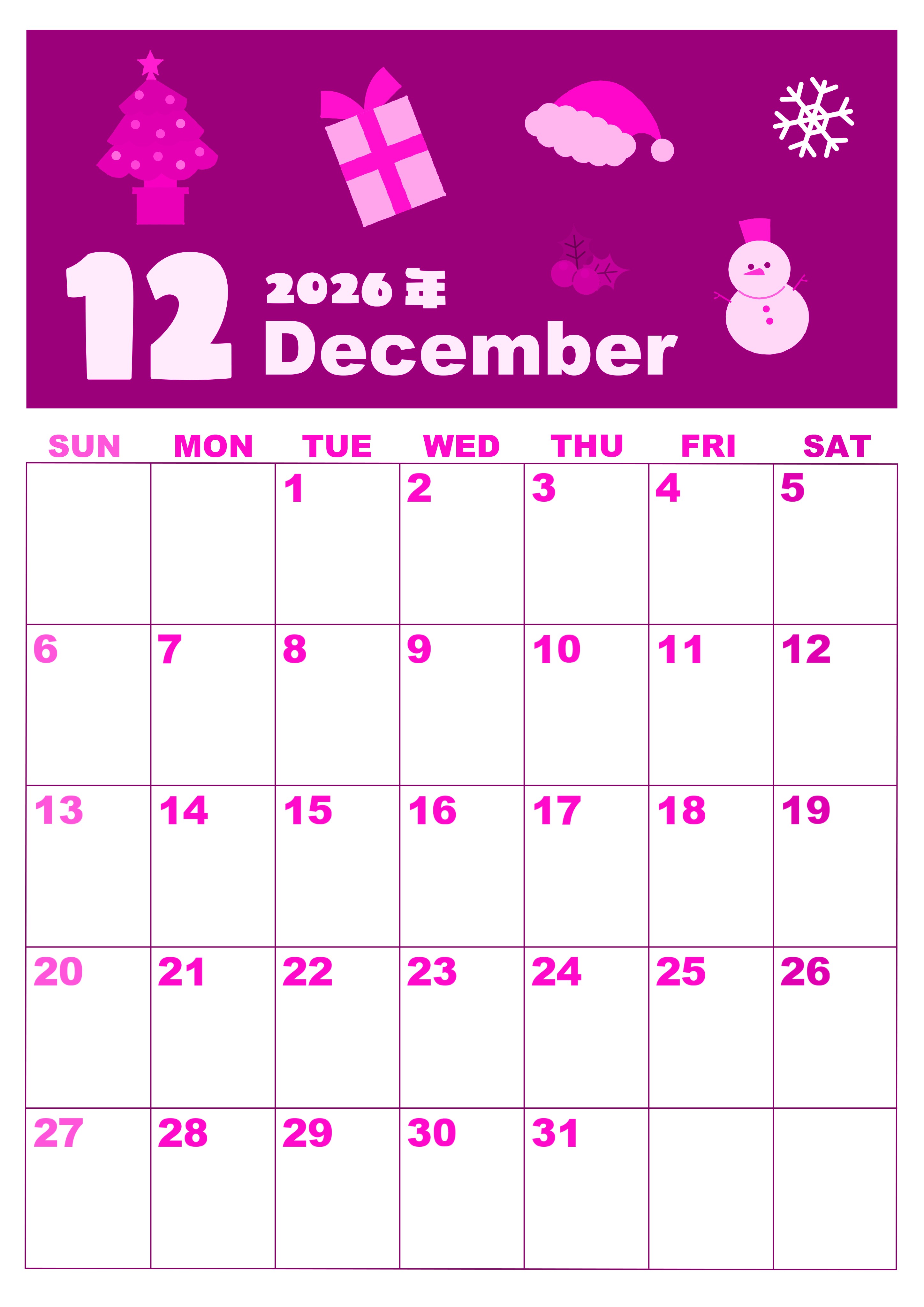 2026年12月縦型日曜始まりの無料テンプレートピンクのカレンダーです。行事のワクワクに拍車をかけてくれるようなかわいいイラストがとても特徴的なレイアウトとなっています。予定の把握にもおすすめです。(2026-00801210)