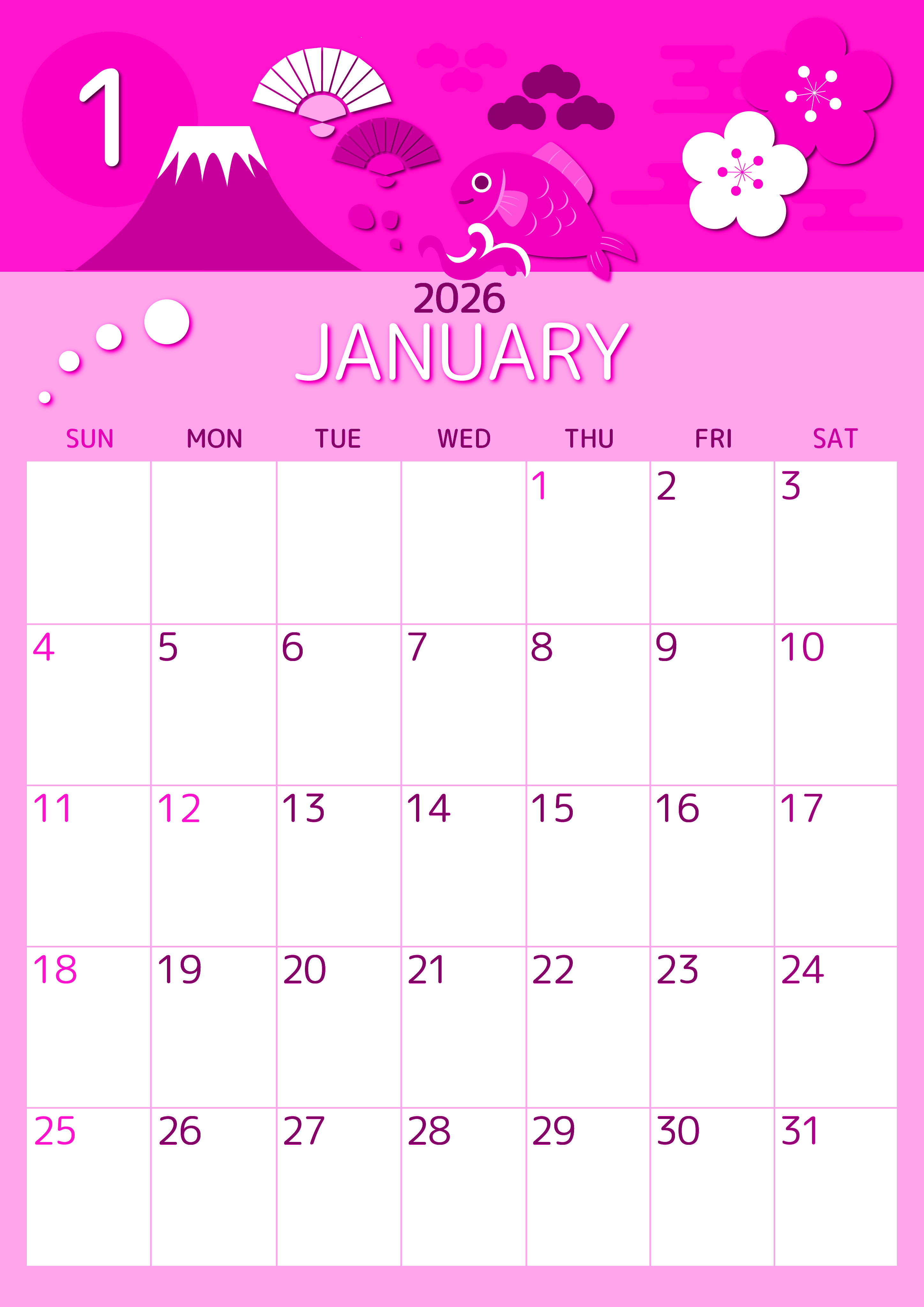 2026年1月縦型日曜始まりピンクのカレンダーです。和風でデザインがはっきりしているので印刷用にぴったりなピンクのカレンダーです。イラストもそれぞれのポイントがかわいいので使っていてウキウキするようなフリー素材です。(2026-00810110)