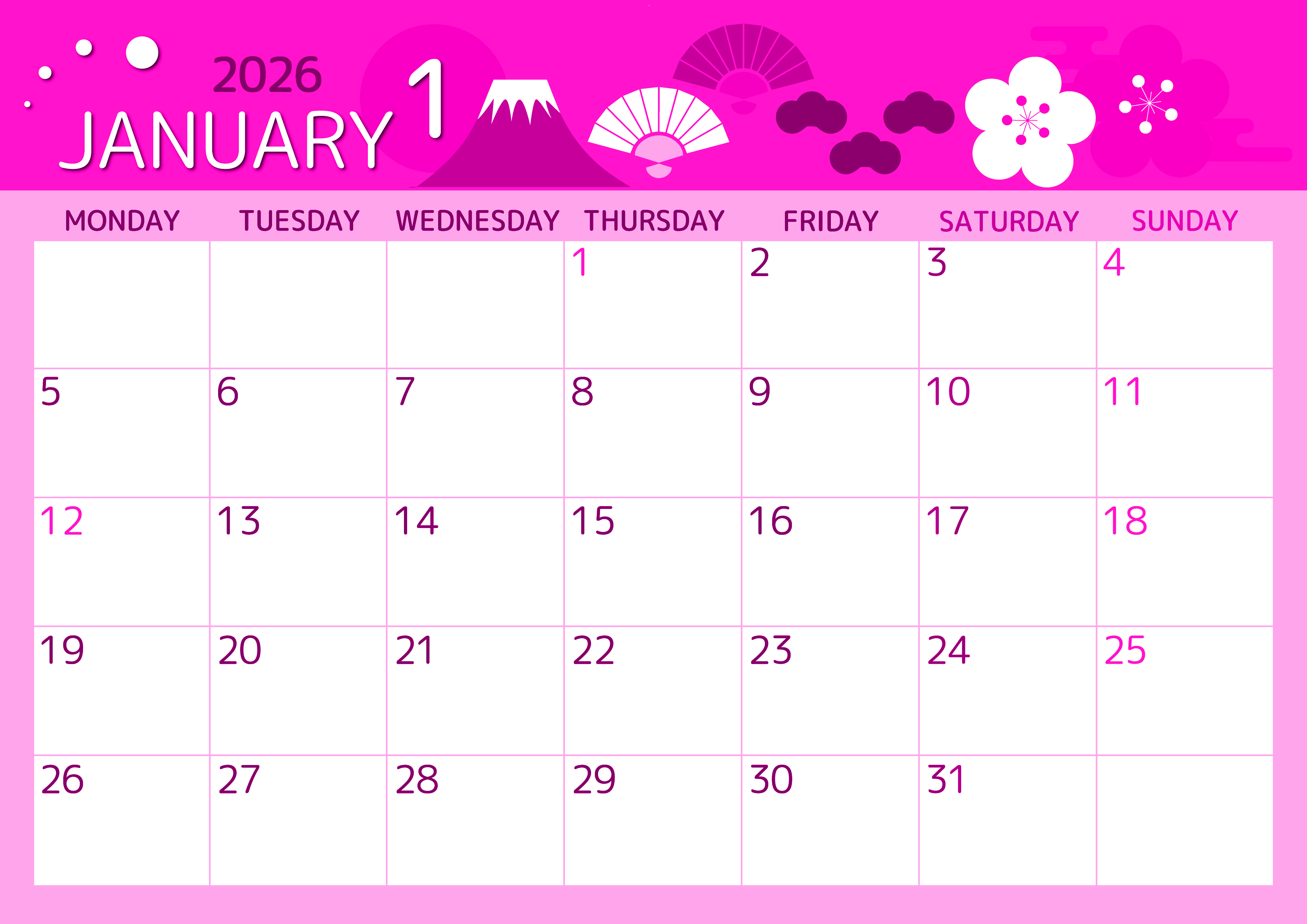 2026年1月横型月曜始まりピンクのカレンダーです。和風で新年の明るい未来を思わせるくっきりしたデザインでかわいいイラストとスタンダードでシンプルな罫線で成されているピンクのカレンダーです。曜日によって色分けされていて大きめの余白があるので予定を書き込むのが簡単です。(2026-00810101)