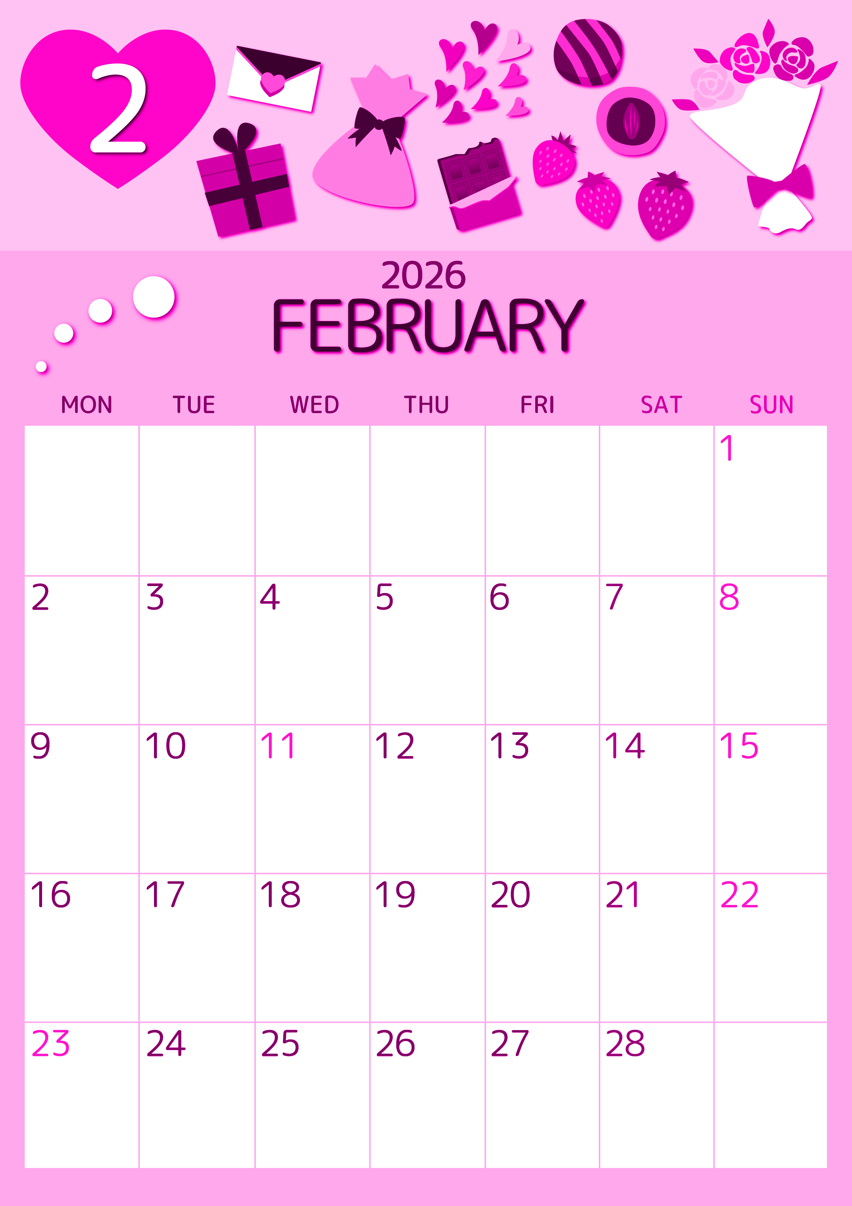 2026年・無料のカレンダーテンプレート 2026年2月縦型月曜始まり プレゼントがかわいいイラストA4無料ピンクのカレンダー(2026-00810211) 素材状デザイン王 2025年4月3日 2026年2月縦型月曜始まりの無料テンプレートピンクのカレンダーです。月曜始まりでバレンタインのムードがぎっしり詰まっている心躍るようなかわいいイラストピンクのカレンダーテンプレートです。(2026-00810211) 2月 縦型のカレンダー 月曜始まり ピンク カレンダーデザイン-0081
