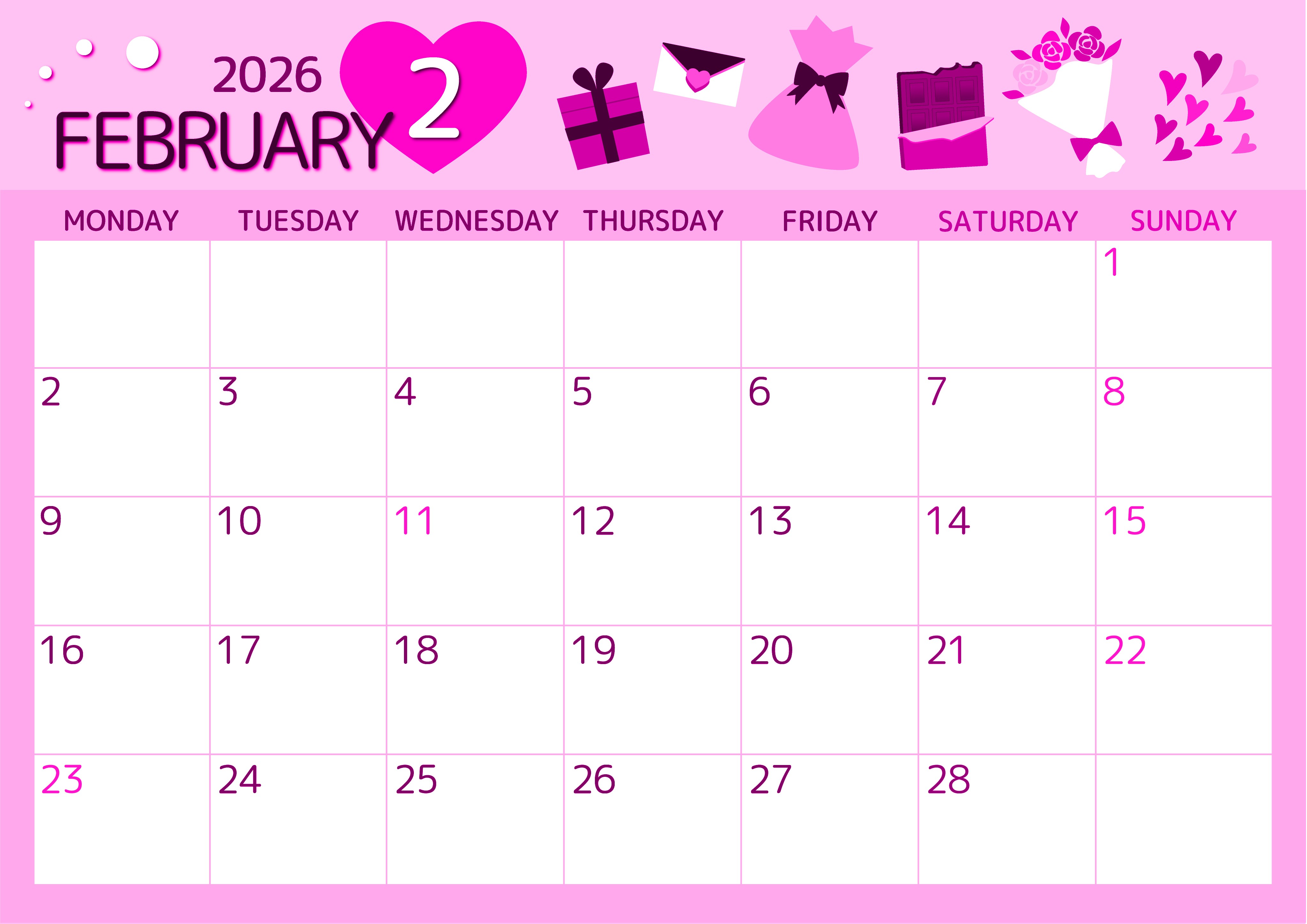 2026年2月横型月曜始まりの無料テンプレートピンクのカレンダーです。チョコや花束といったもらって嬉しいプレゼントのイラストがかわいい月曜始まりの罫線が見やすいタスク管理に適した無料ピンクのカレンダーです。(2026-00810201)