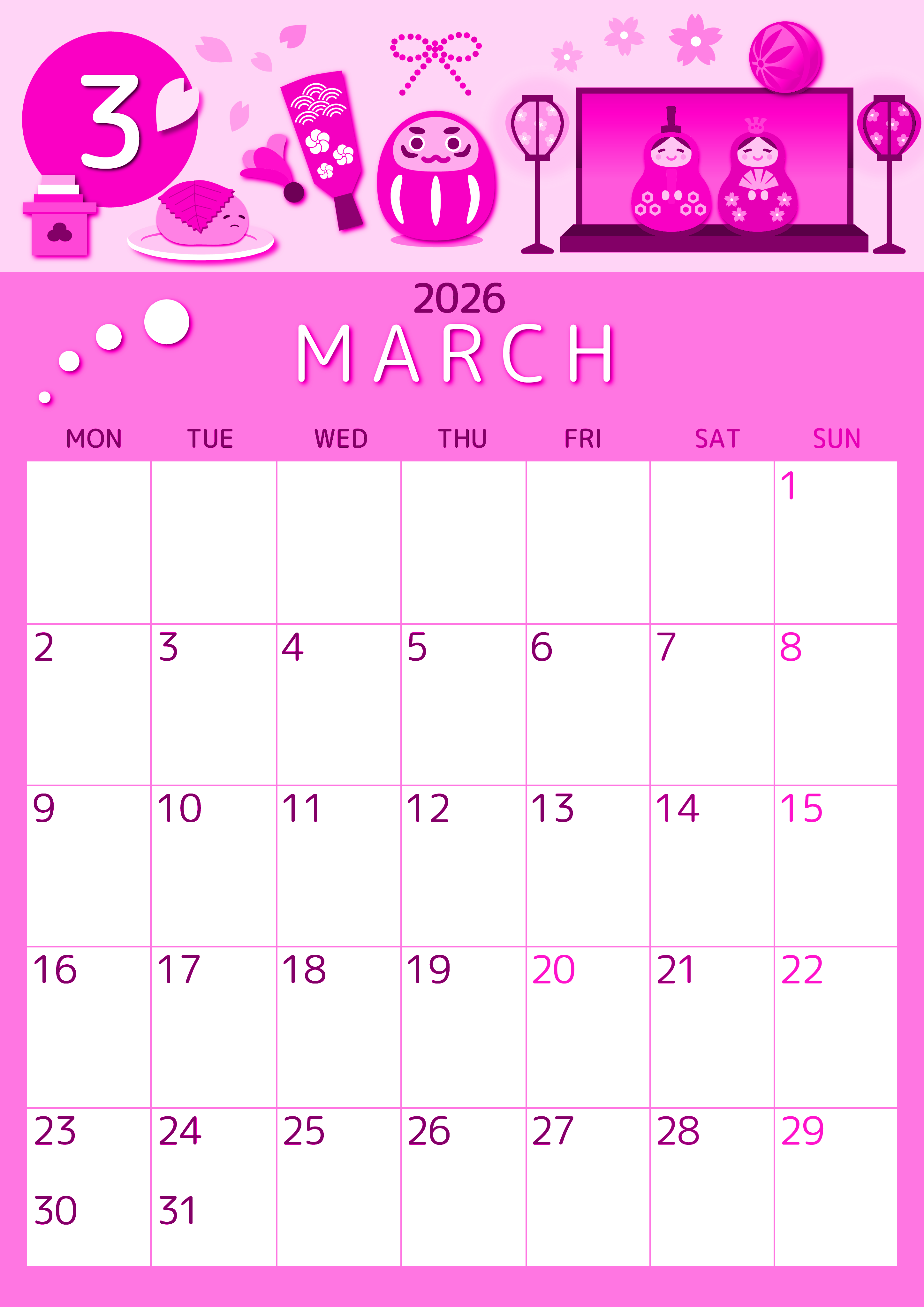 2026年3月縦型月曜始まりの無料テンプレートピンクのカレンダーです。月曜始まりのピンクのカレンダーしか使いたくないという人におすすめしたいシンプルでかわいいイラストテンプレートです。(2026-00810311)