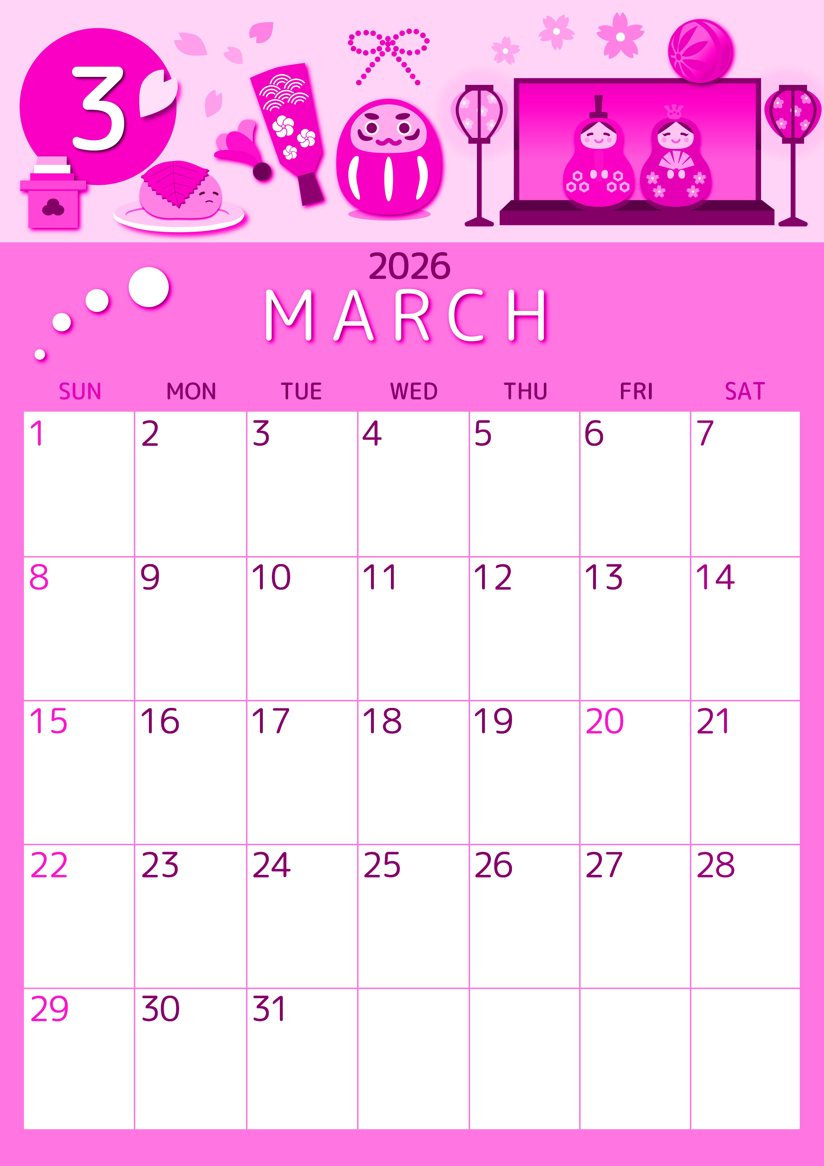 2026年3月縦型日曜始まりの無料テンプレートピンクのカレンダーです。スケジュール記入欄には色分けされている曜日が分かりやすい日付が印字されている使いやすいピンクのカレンダーです。イラストもシンプルかつかわいいものとなっています。(2026-00810310)