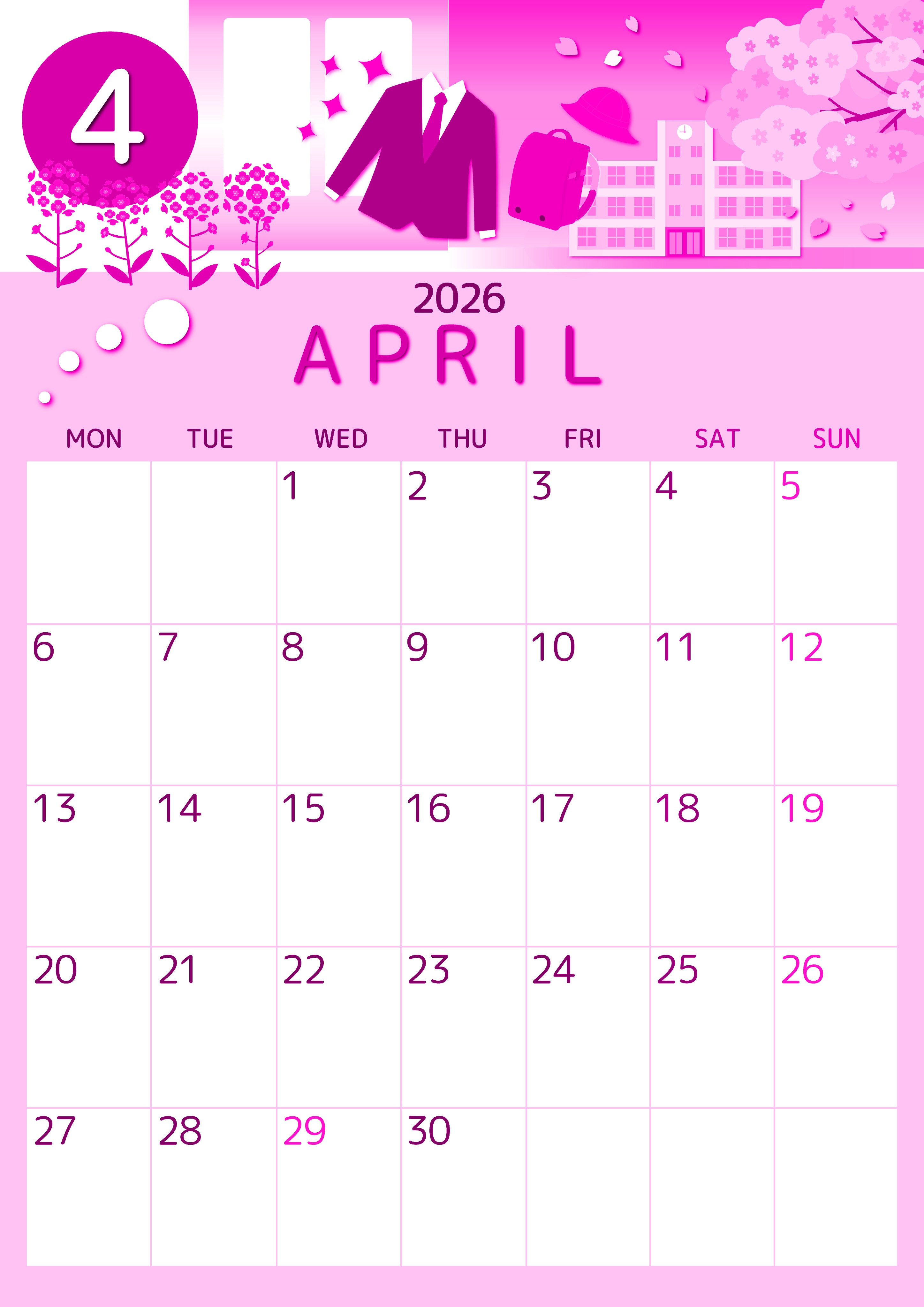 2026年4月縦型月曜始まりの無料テンプレートピンクのカレンダーです。緑を基調にしているピンクのカレンダーなので見やすいです。月曜始まりでダウンロードは無料です。入学式モチーフのイラストもかわいいのでおすすめです。(2026-00810411)