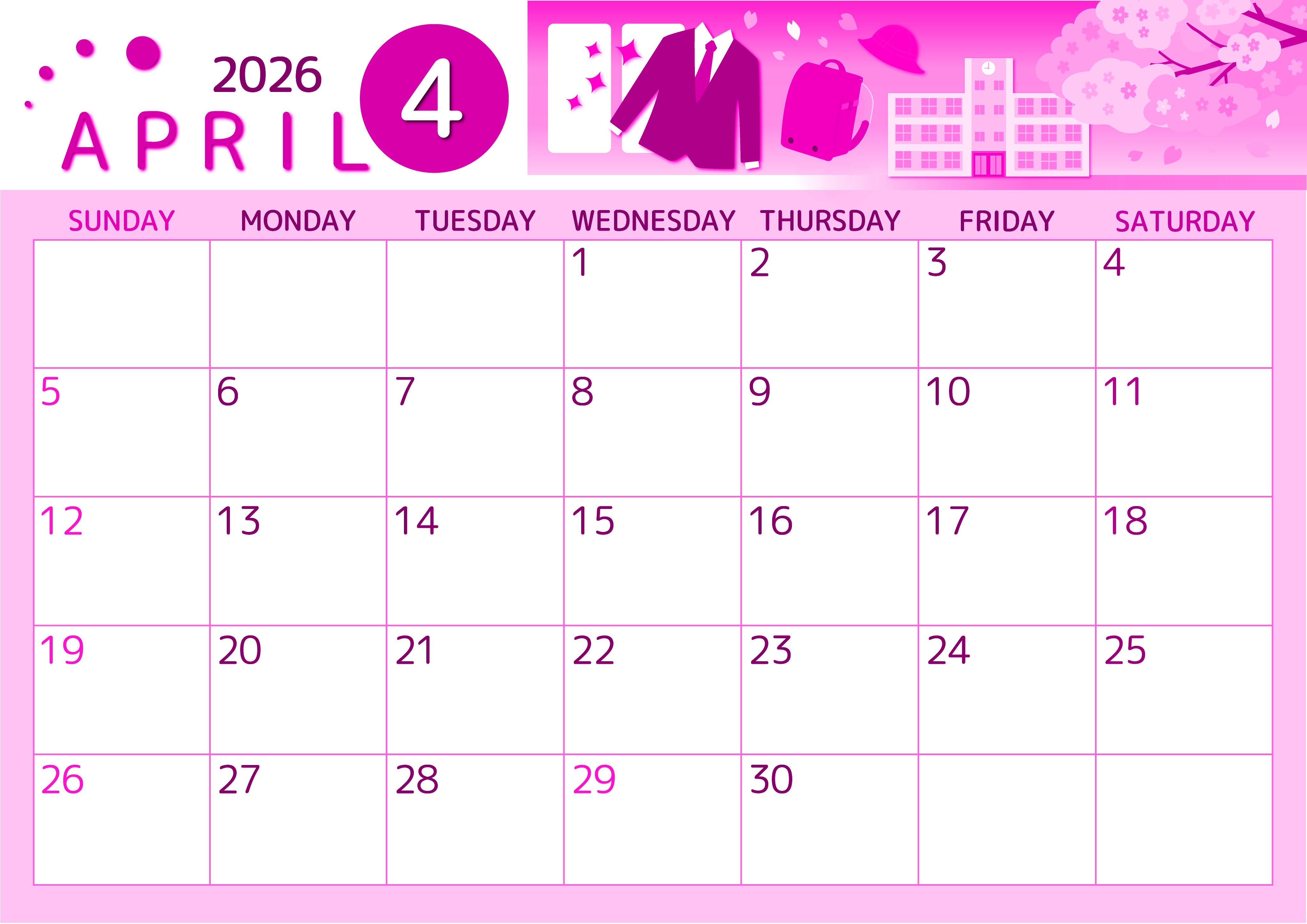 2026年4月横型日曜始まりの無料テンプレートピンクのカレンダーです。入学式に不可欠な制服やランドセルといったイラストがもりだくさんのかわいいピンクのカレンダーです。子供たちの勉強の予定を立てるのにもおすすめします。(2026-00810400)