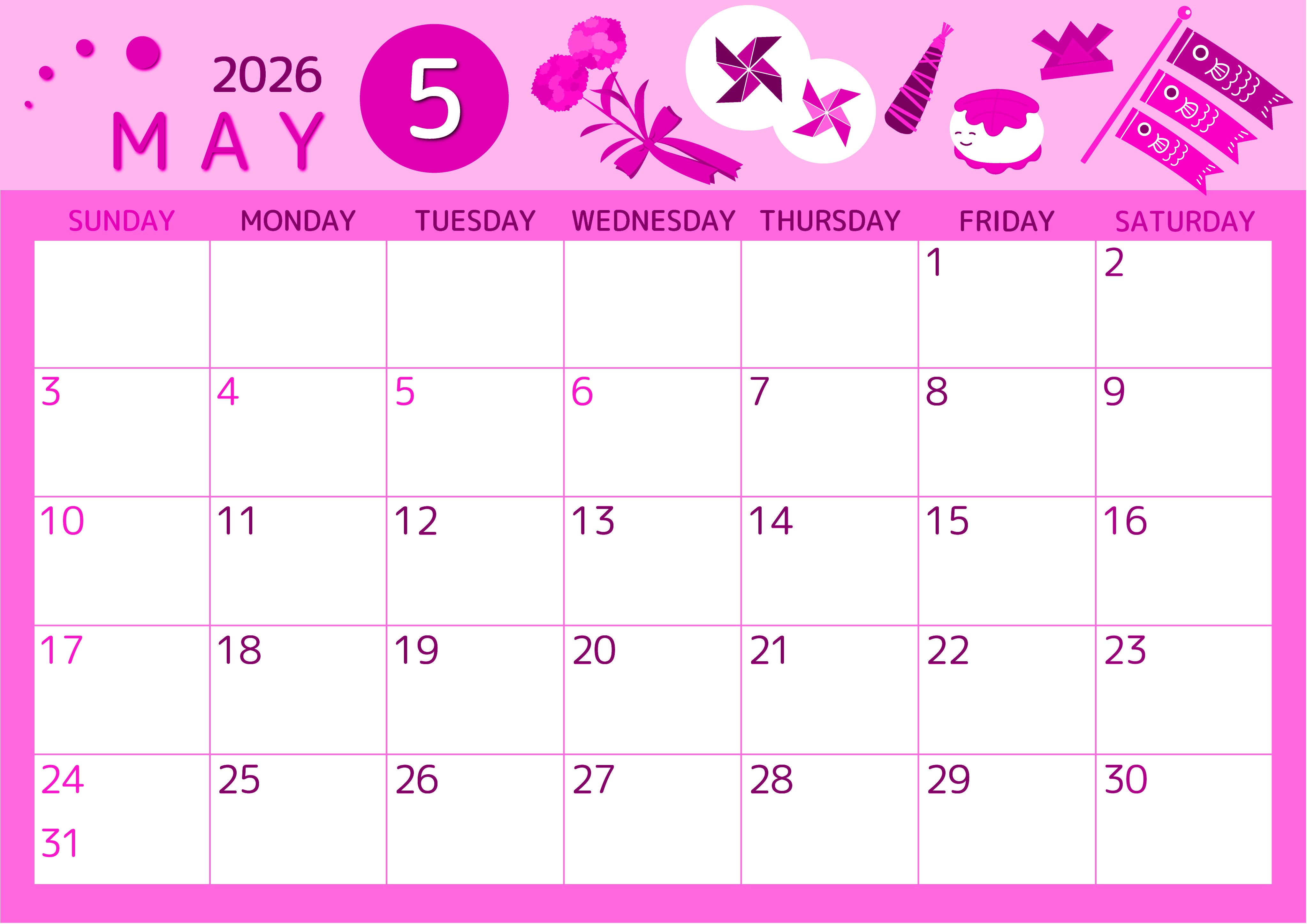 2026年5月横型日曜始まりの無料テンプレートピンクのカレンダーです。5月は沢山のイベントが控えています。ゴールデンウィーク、母の日、子供の日…。わくわくな気持ちにさせてくれるようなかわいいイラストピンクのカレンダーです。(2026-00810500)