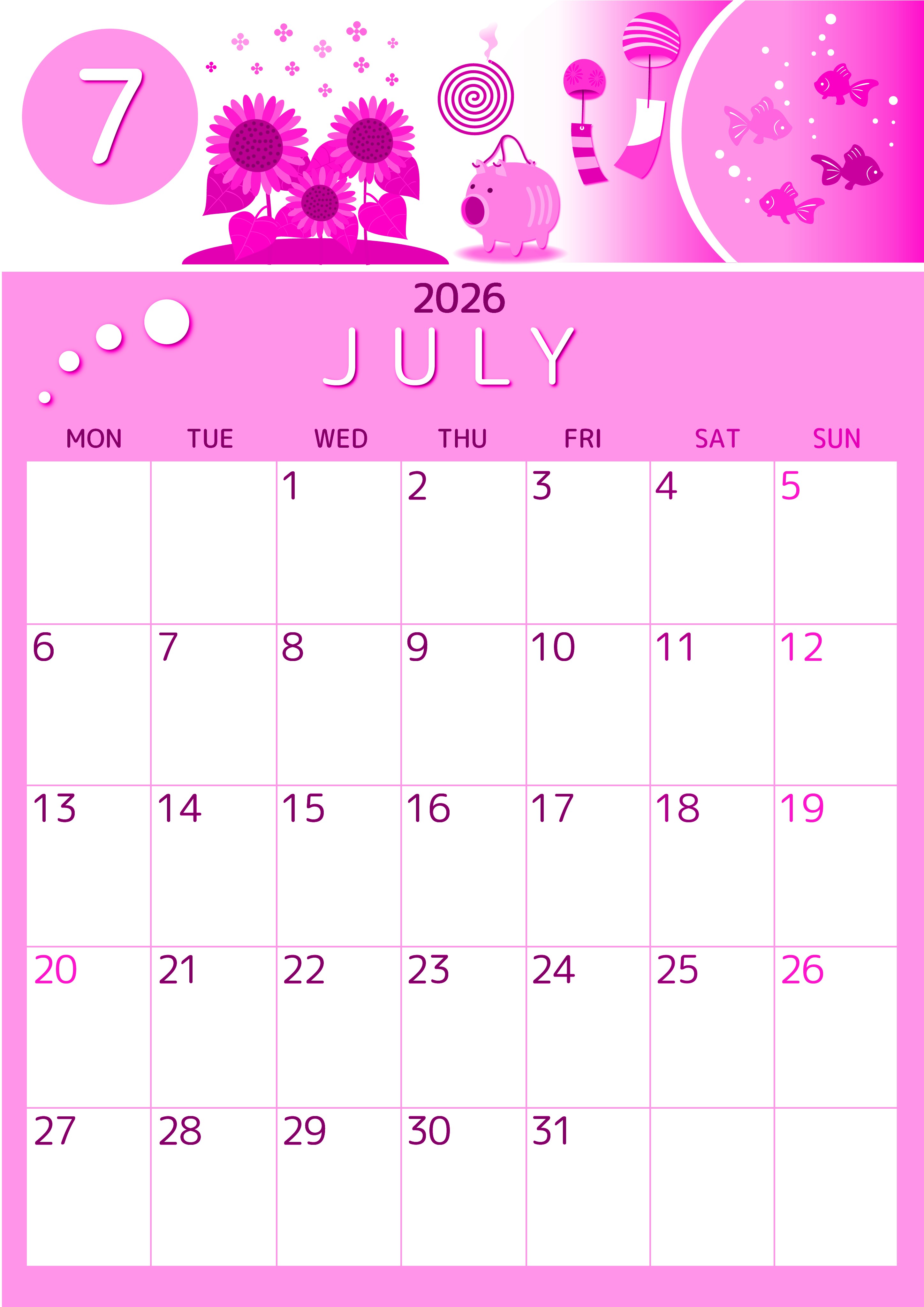 2026年7月縦型月曜始まりの無料テンプレートピンクのカレンダーです。蚊取り線香が目を引くかわいいイラスト付きの使い勝手の良いレイアウトのピンクのカレンダーです。夏休みを充実する為に家族でお使い頂くのも良いです。(2026-00810711)