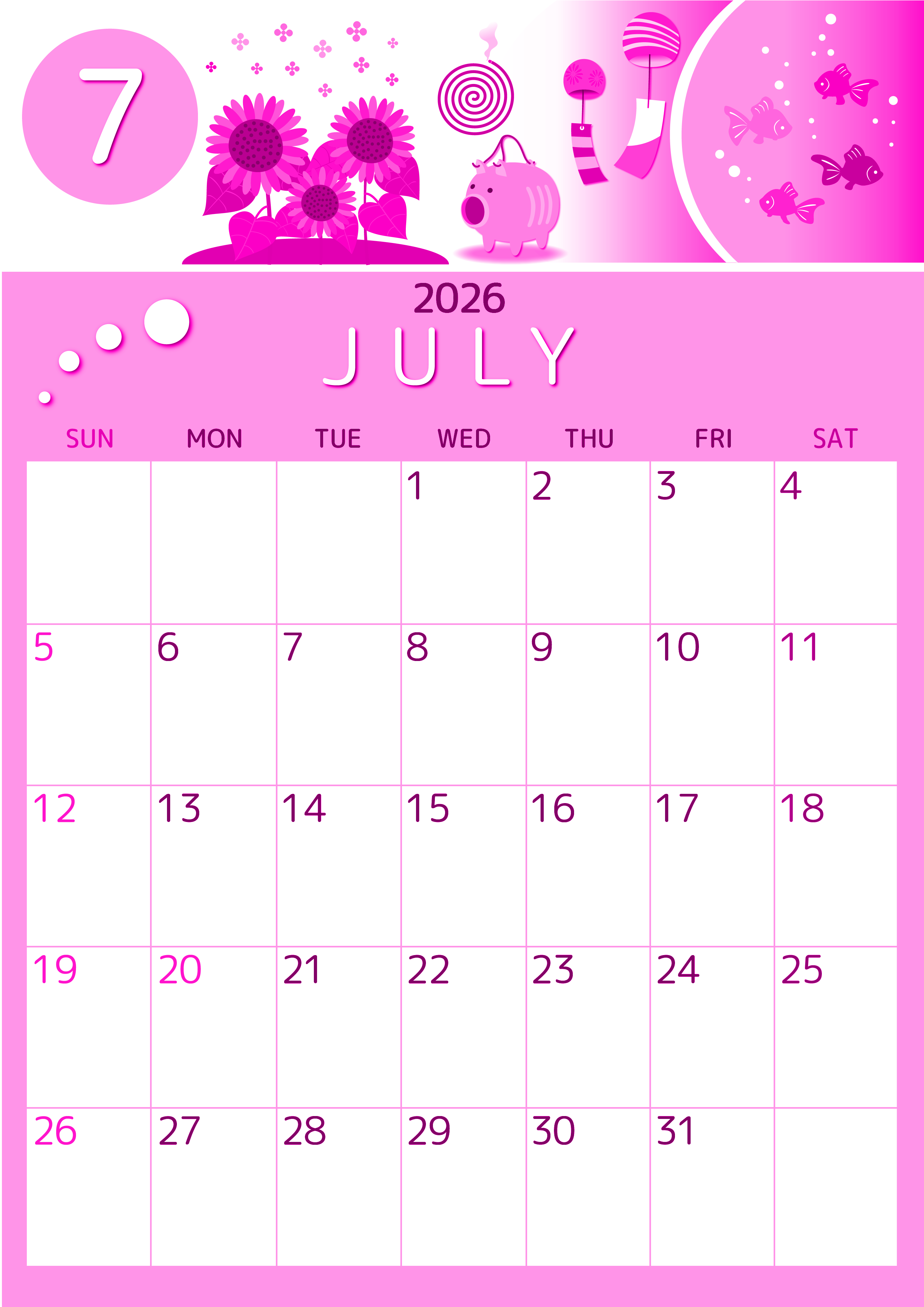 2026年7月縦型日曜始まりの無料テンプレートピンクのカレンダーです。夏休みの忙しい計画を立てるのにぴったりなピンクのカレンダーです。イラストには蚊取り線香や金魚が取り上げられていてかわいいだけでなく丁寧に描かれた精度の高いコンテンツです。(2026-00810710)