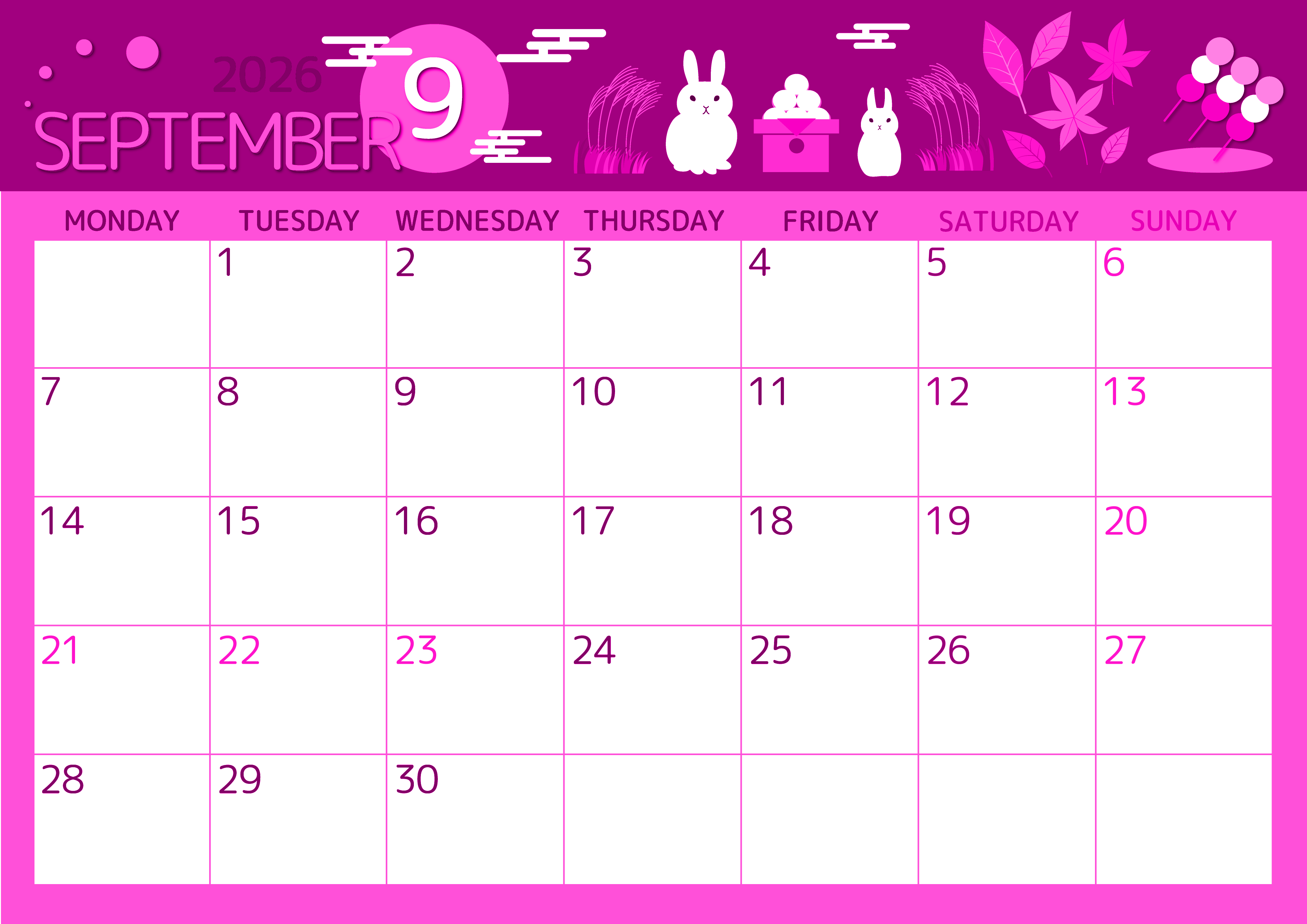 2026年9月横型月曜始まりの無料テンプレートピンクのカレンダーです。十五夜をテーマにしたイラストがふんだんに描かれています。うさぎさんがかわいいです。三色団子や紅葉やススキや満月も目を引くポイントです。(2026-00810901)