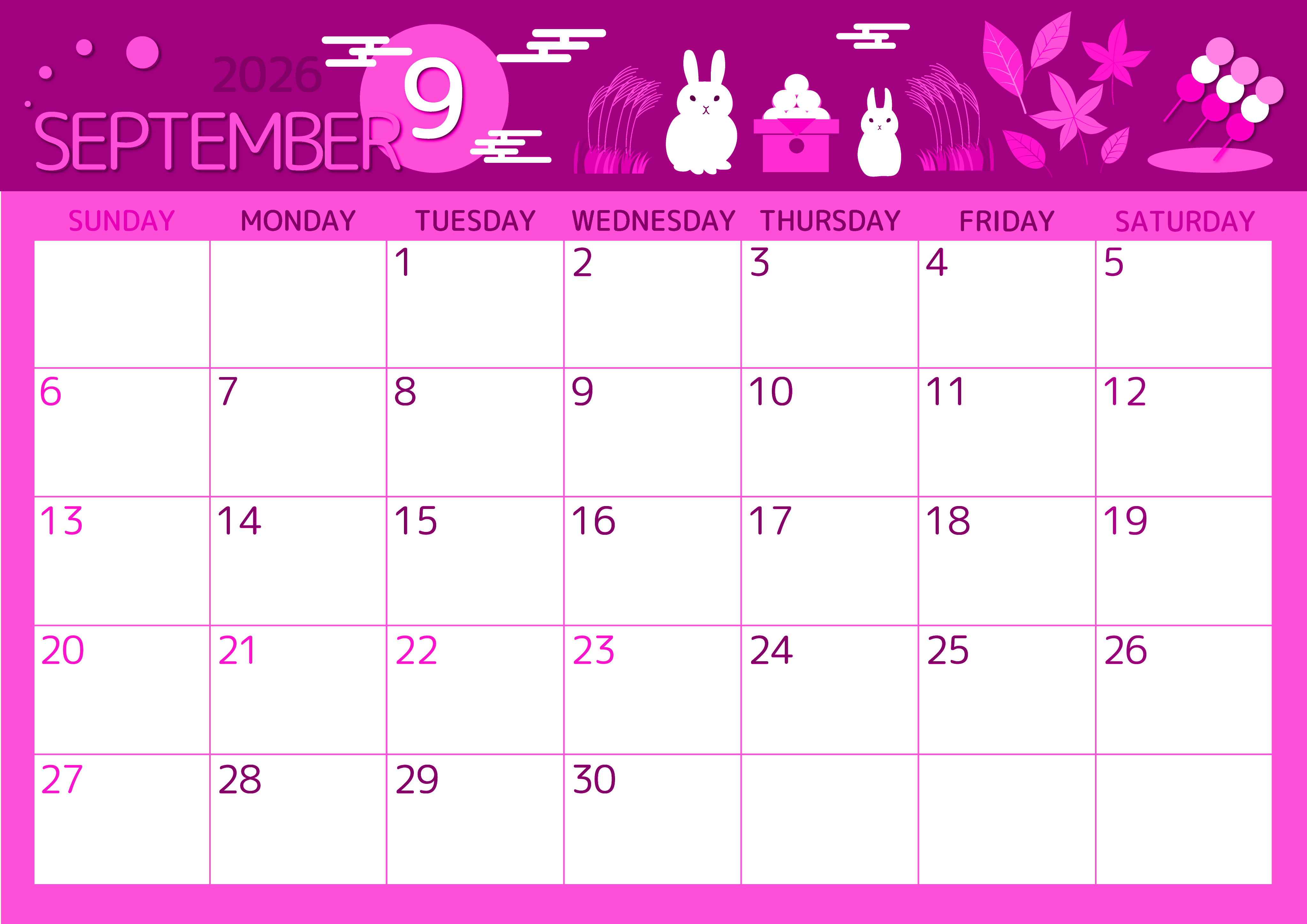 2026年9月横型日曜始まりの無料テンプレートピンクのカレンダーです。十五夜の様子を非常に賑やかに細かく書き上げたかわいいイラストにピンクのカレンダー部分をフレーミングしたとてもかわいいデザインです。(2026-00810900)